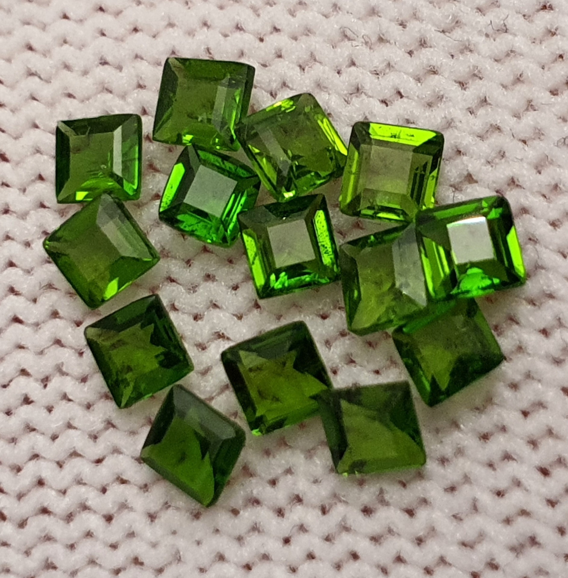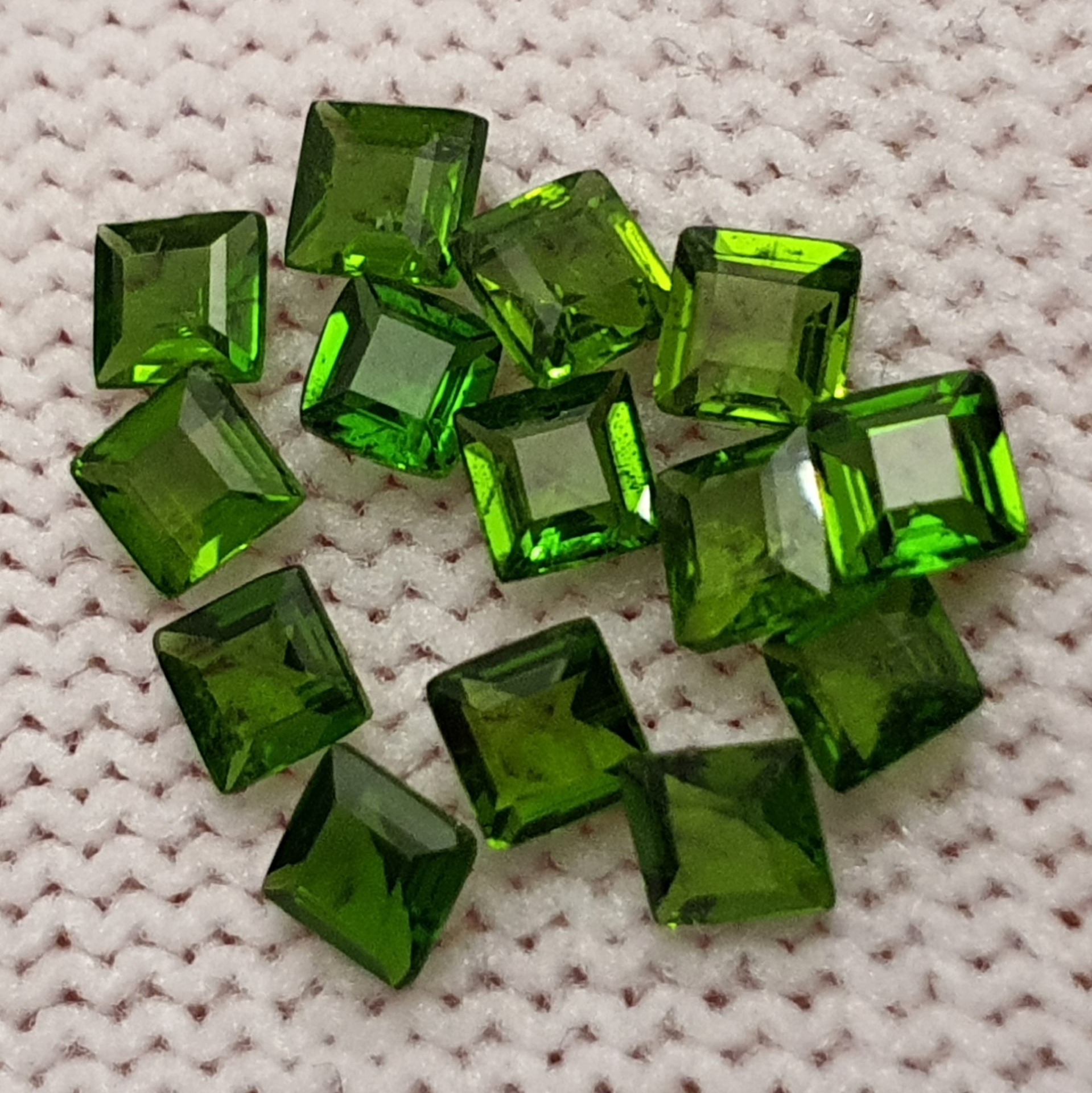 crom-diopsid natural, de un verde-crom mediu-intens-viu, superb, clar si curat, patrat de 3mm; pretul este pentru 1 bc