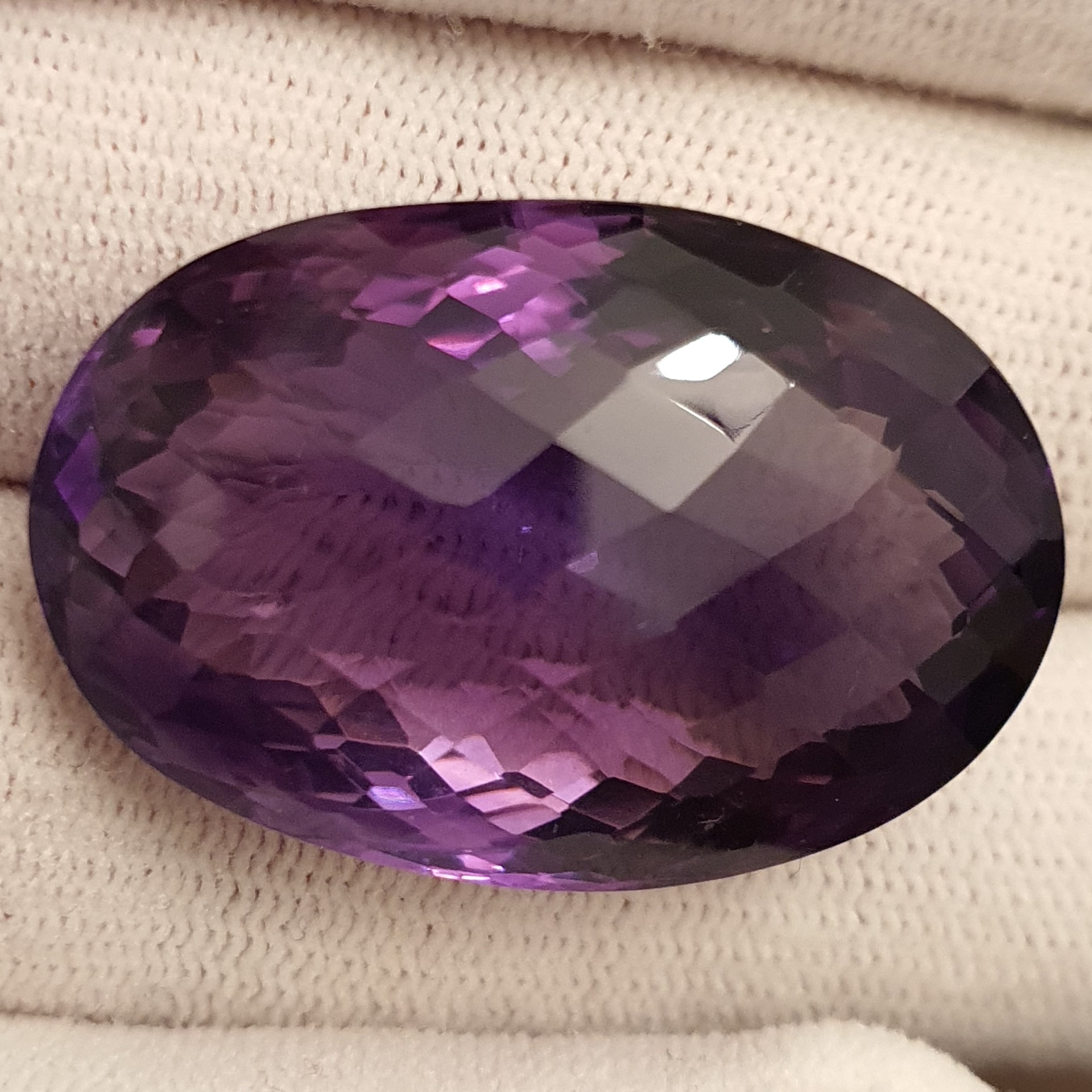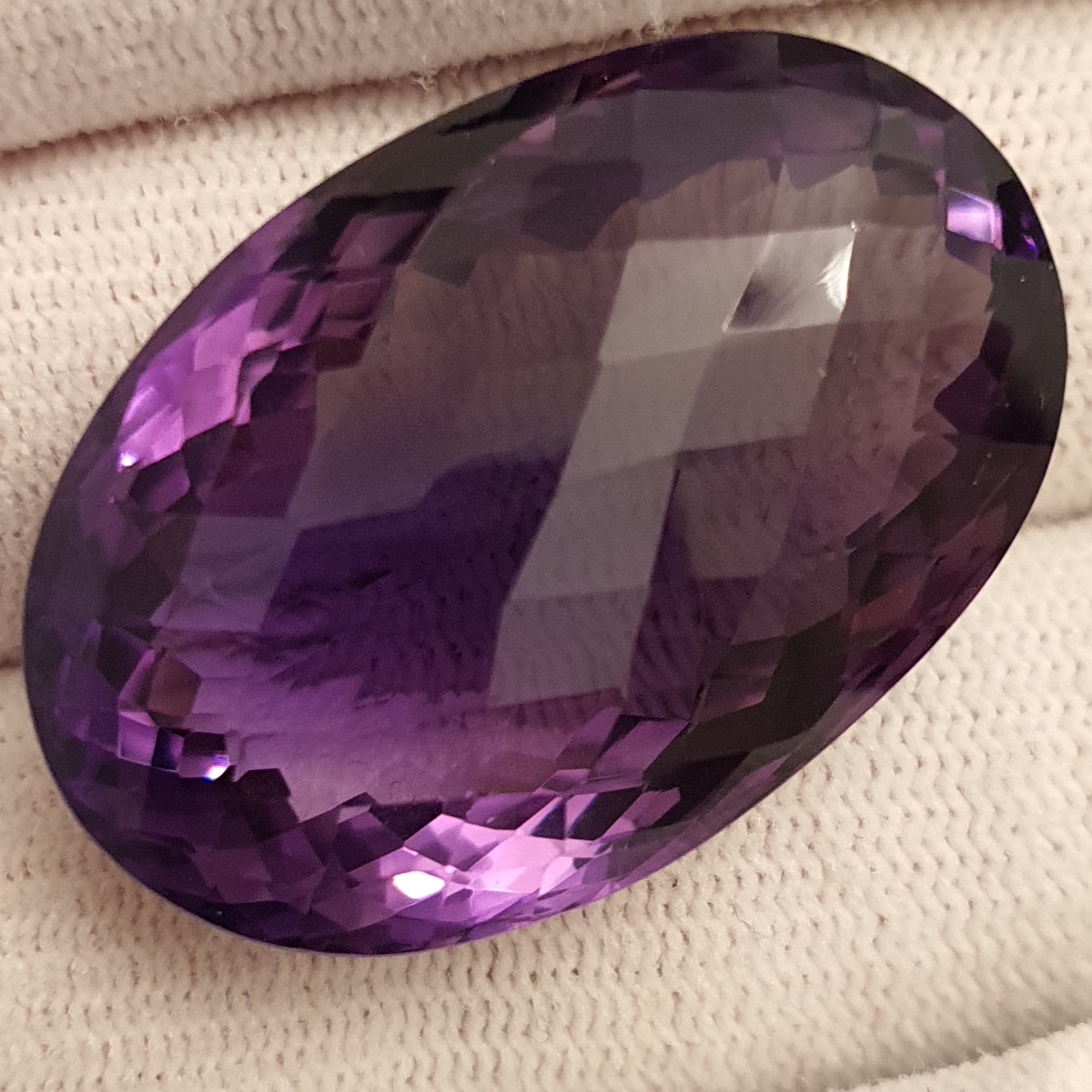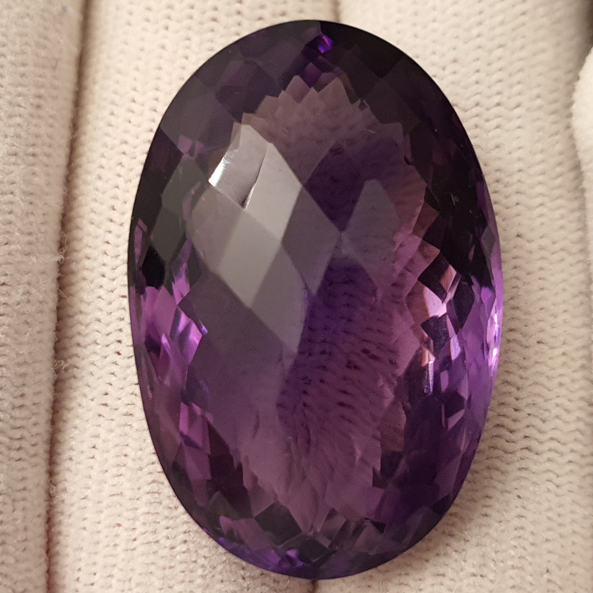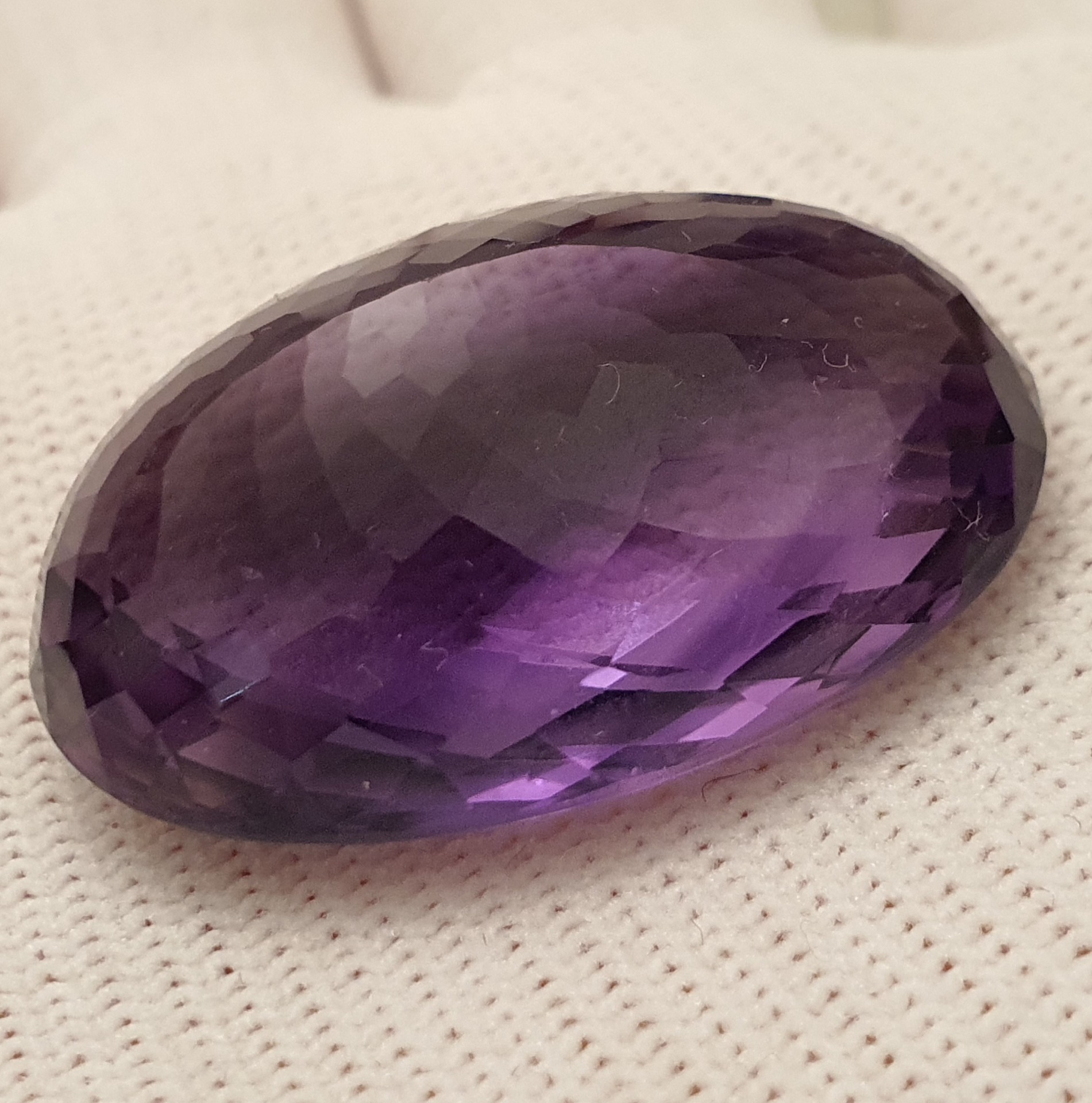 fabulos ametist natural oval, de 70.28 carate, in superbe degradeuri de violet, clar, curat, fatetat tabla de sah, cu dimensiuni ce il recomanda pentru pandantiv / brosa: 33.44 x 22.33 x 16.22