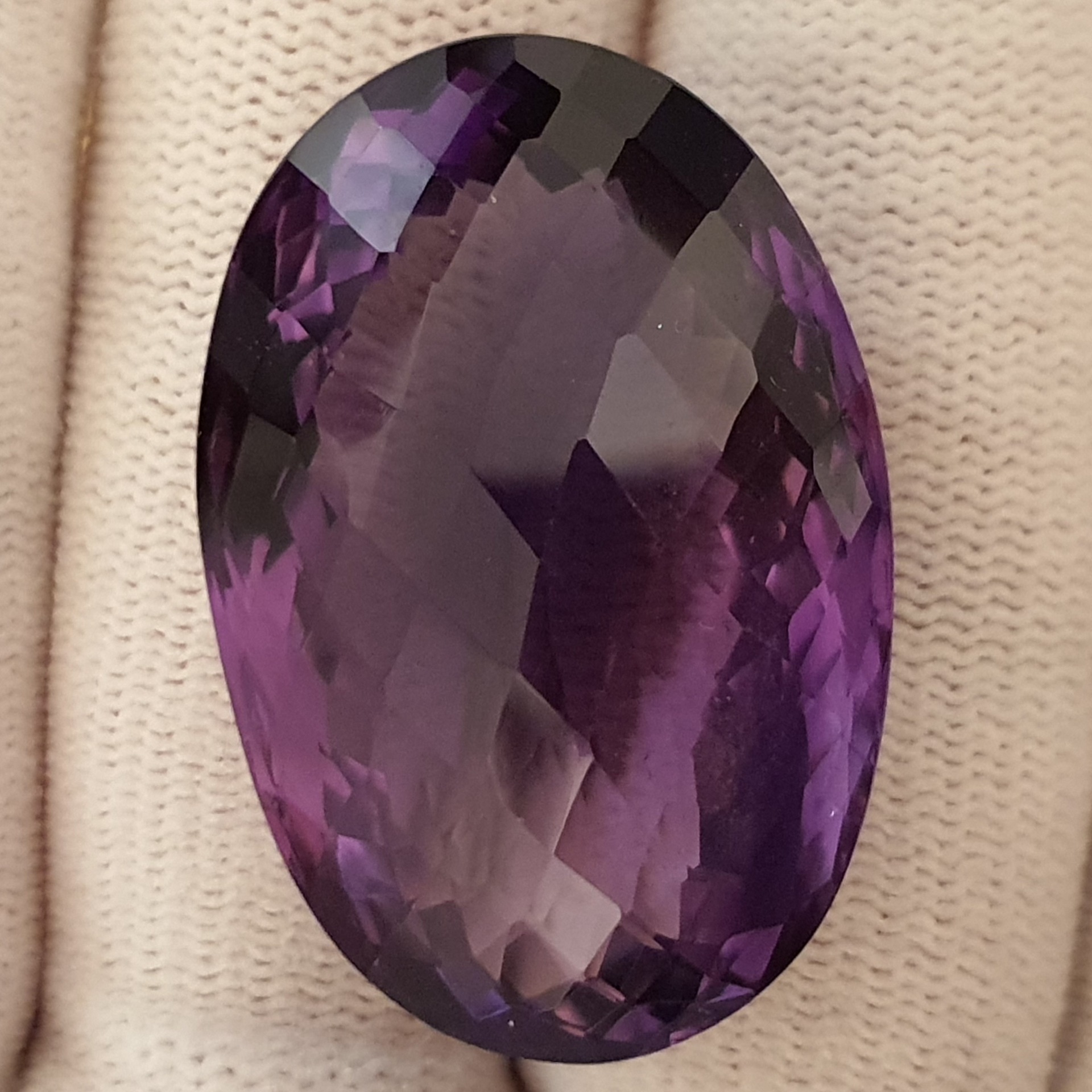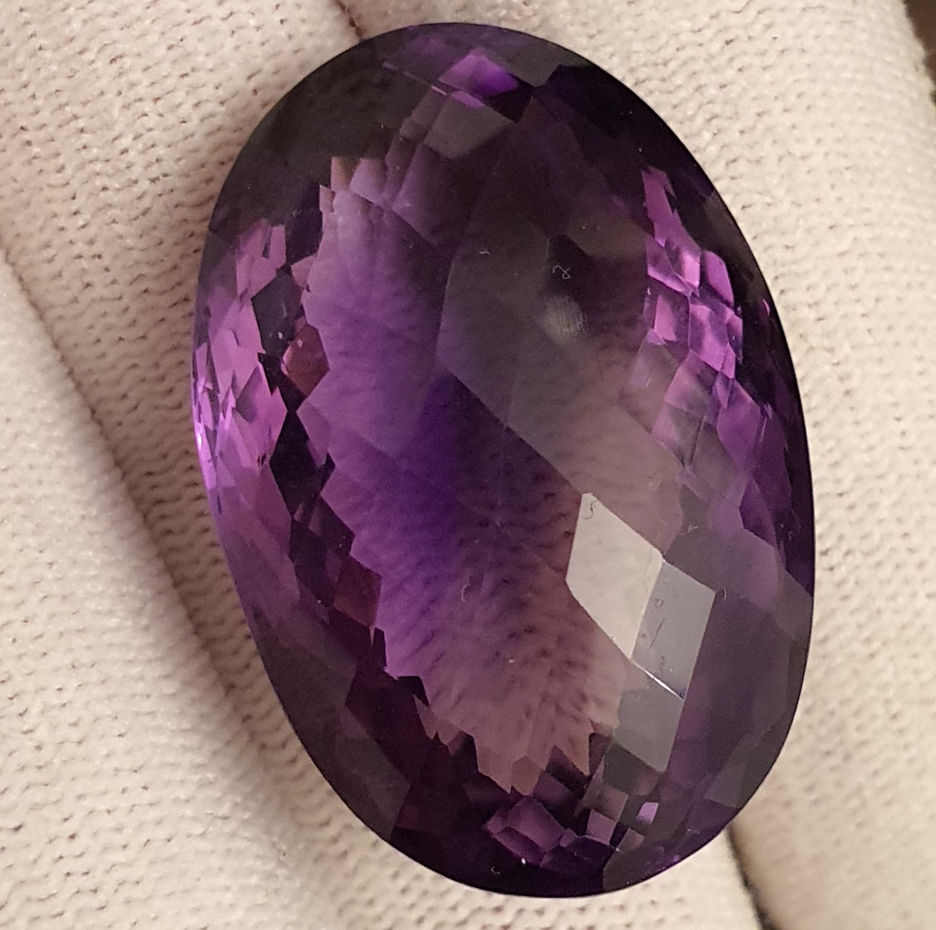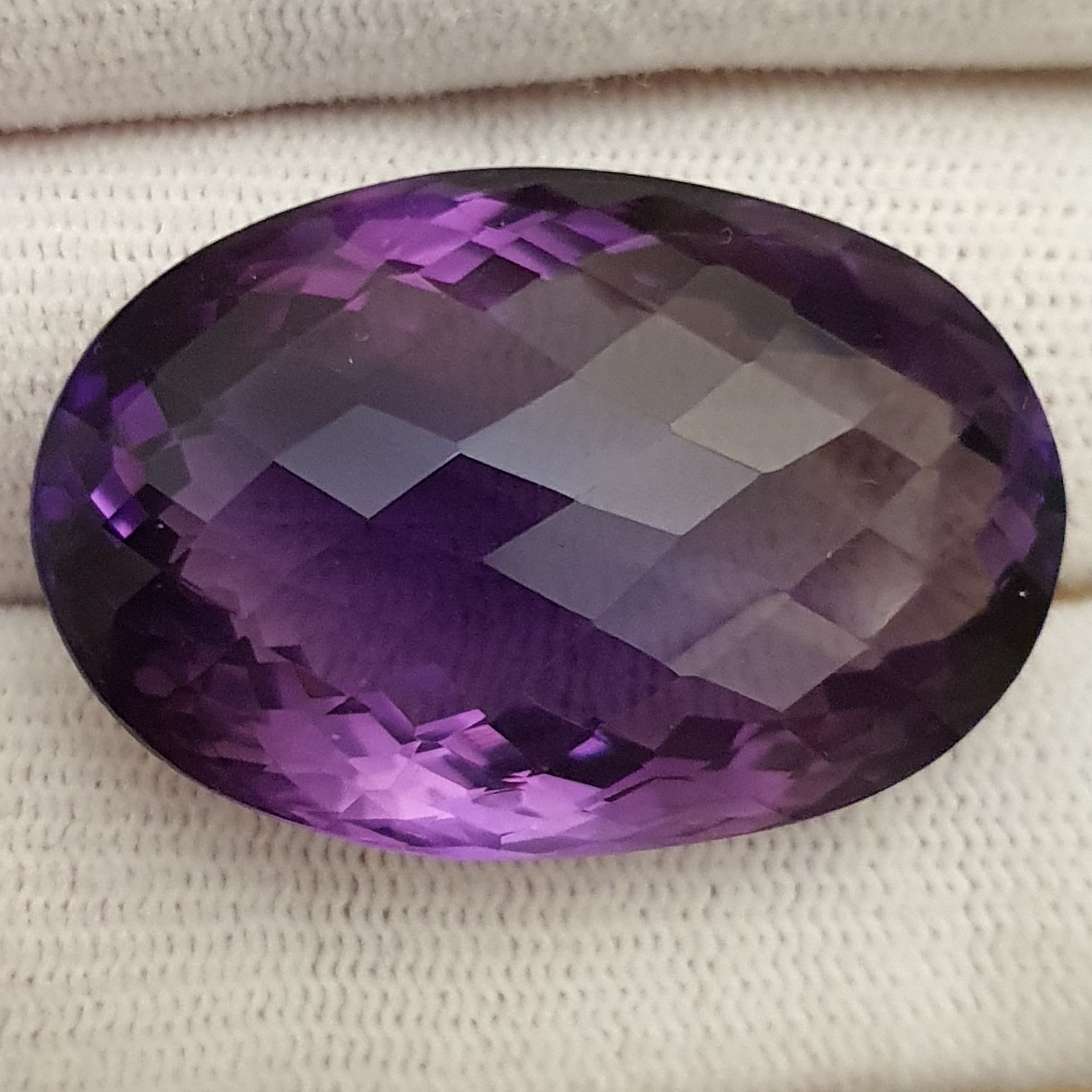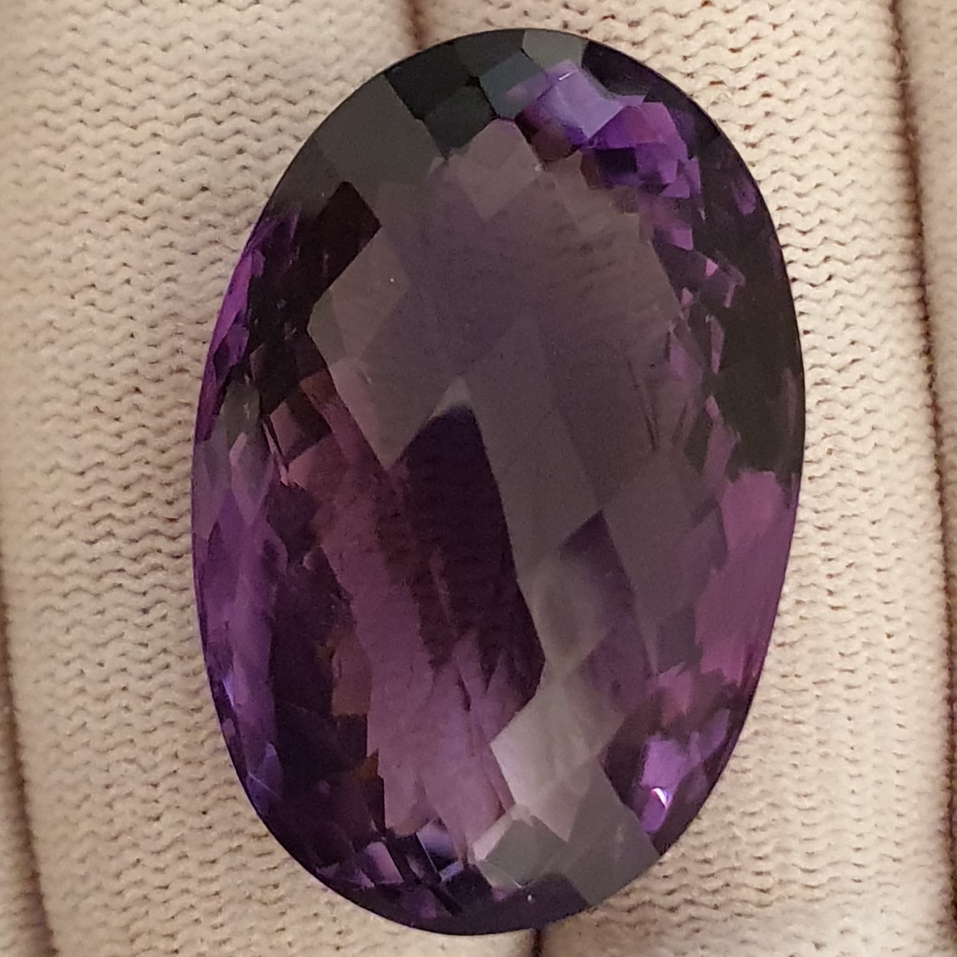 fabulos ametist natural oval, de 70.28 carate, in superbe degradeuri de violet, clar, curat, fatetat tabla de sah, cu dimensiuni ce il recomanda pentru pandantiv / brosa: 33.44 x 22.33 x 16.22