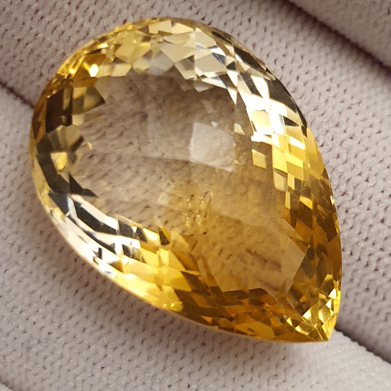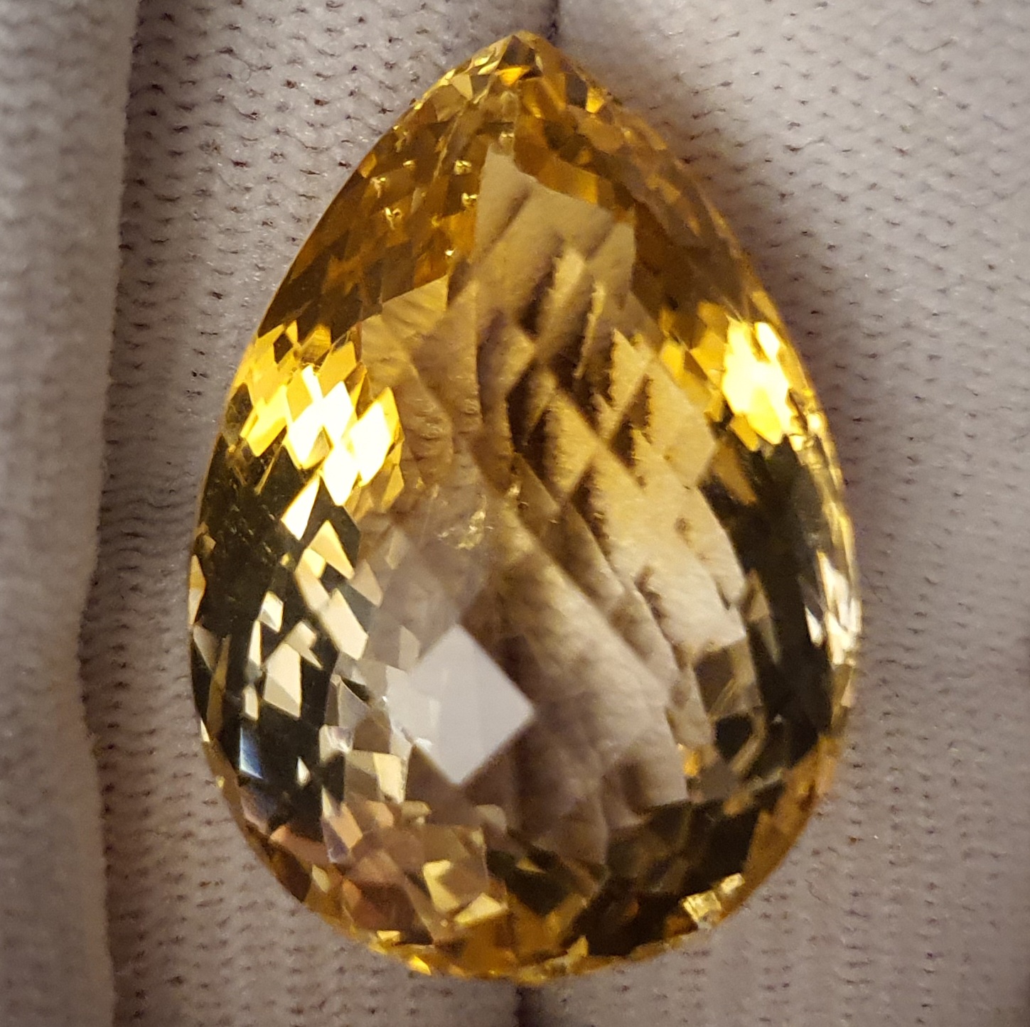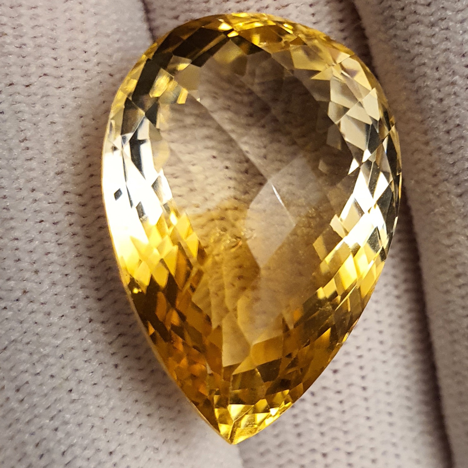 superb citrin natural, picatura fatetata tabla de sah, claritate VS (pe spate are o mica ciobitura de 2x1mm, care, in anumite unghiuri, transpare pe fata, piatra fiind transparenta si foarta curata in rest), in greutate de 42.32ct si cu dimensiunile 26.5 x 18.4 x 15.1mm; citrinul este foarte frumos, se poate monta in aur, iar fatetarea si dimensiunile il recomanda pentru un pandantiv