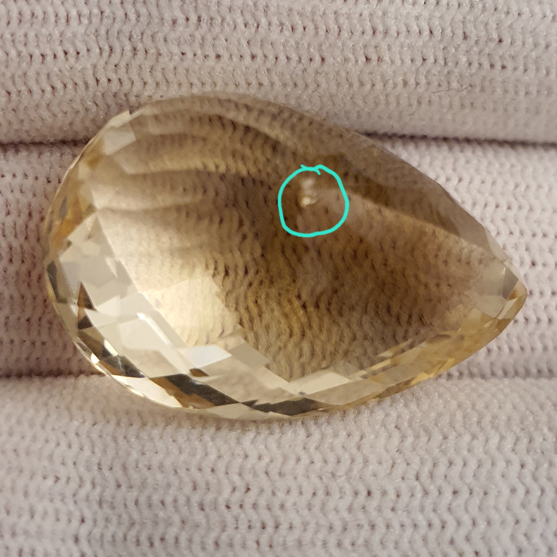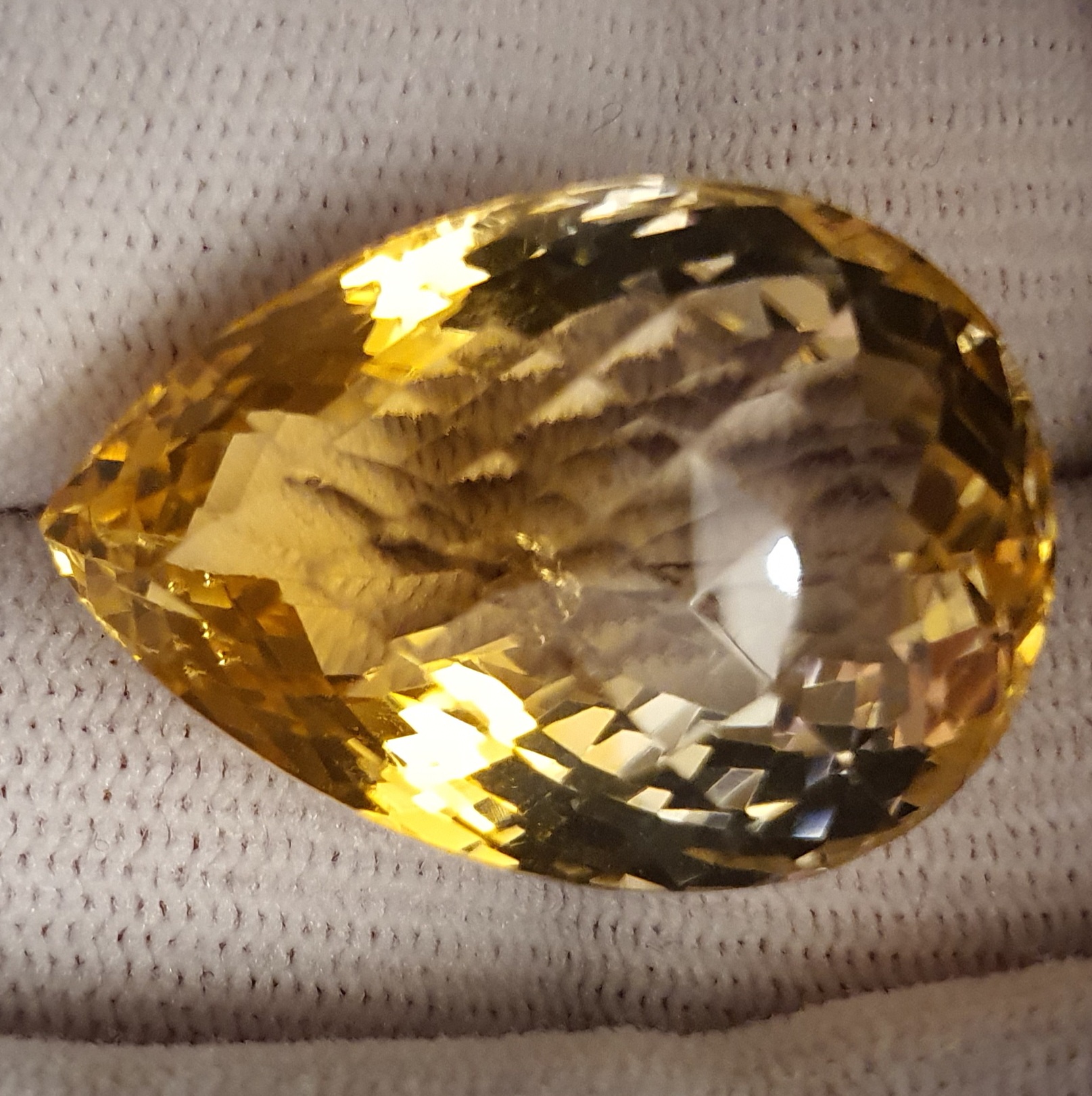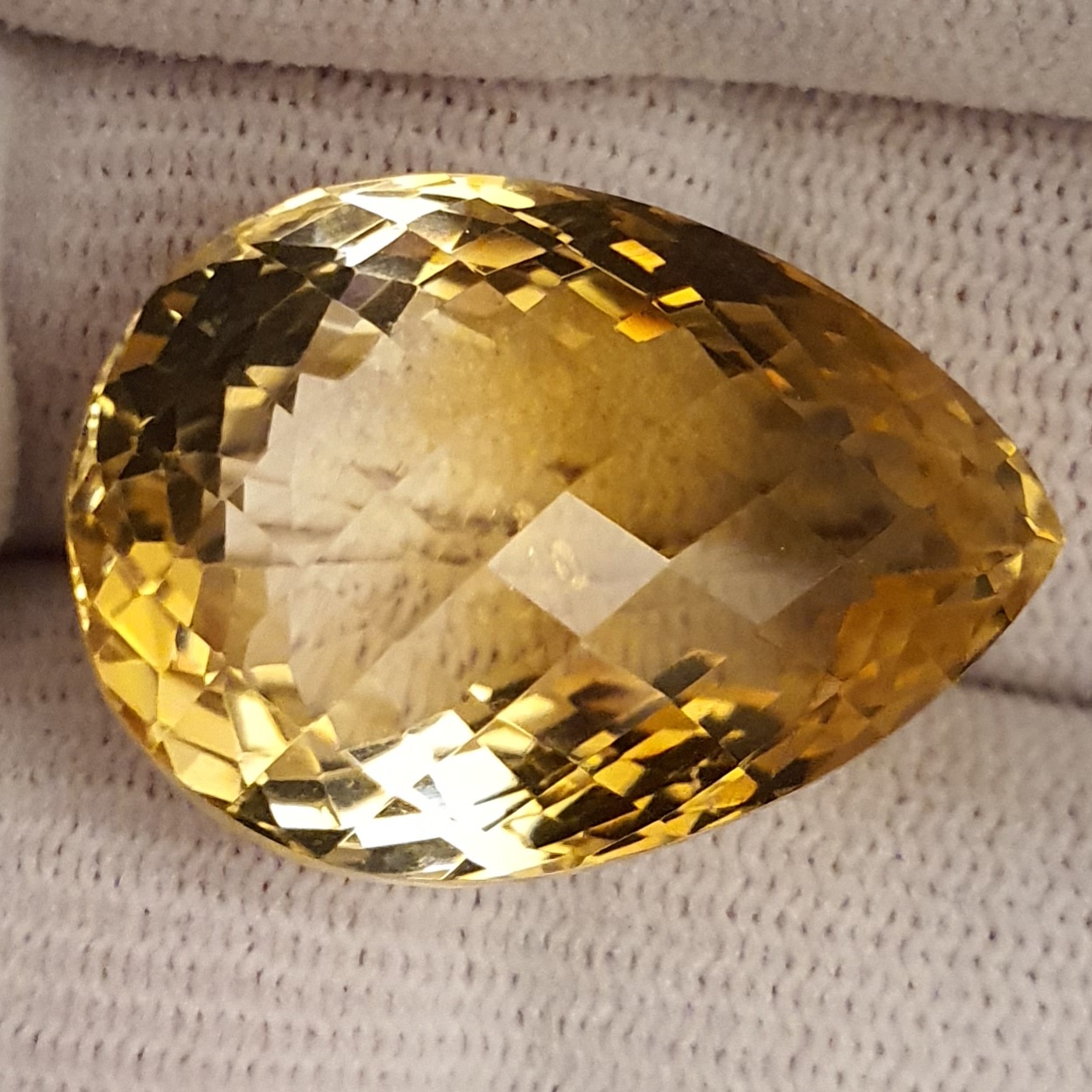 superb citrin natural, picatura fatetata tabla de sah, claritate VS (pe spate are o mica ciobitura de 2x1mm, care, in anumite unghiuri, transpare pe fata, piatra fiind transparenta si foarta curata in rest), in greutate de 42.32ct si cu dimensiunile 26.5 x 18.4 x 15.1mm; citrinul este foarte frumos, se poate monta in aur, iar fatetarea si dimensiunile il recomanda pentru un pandantiv