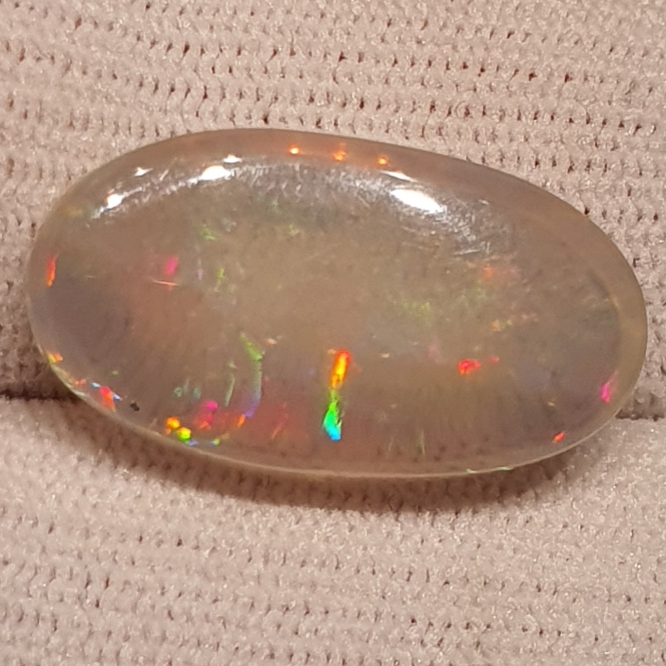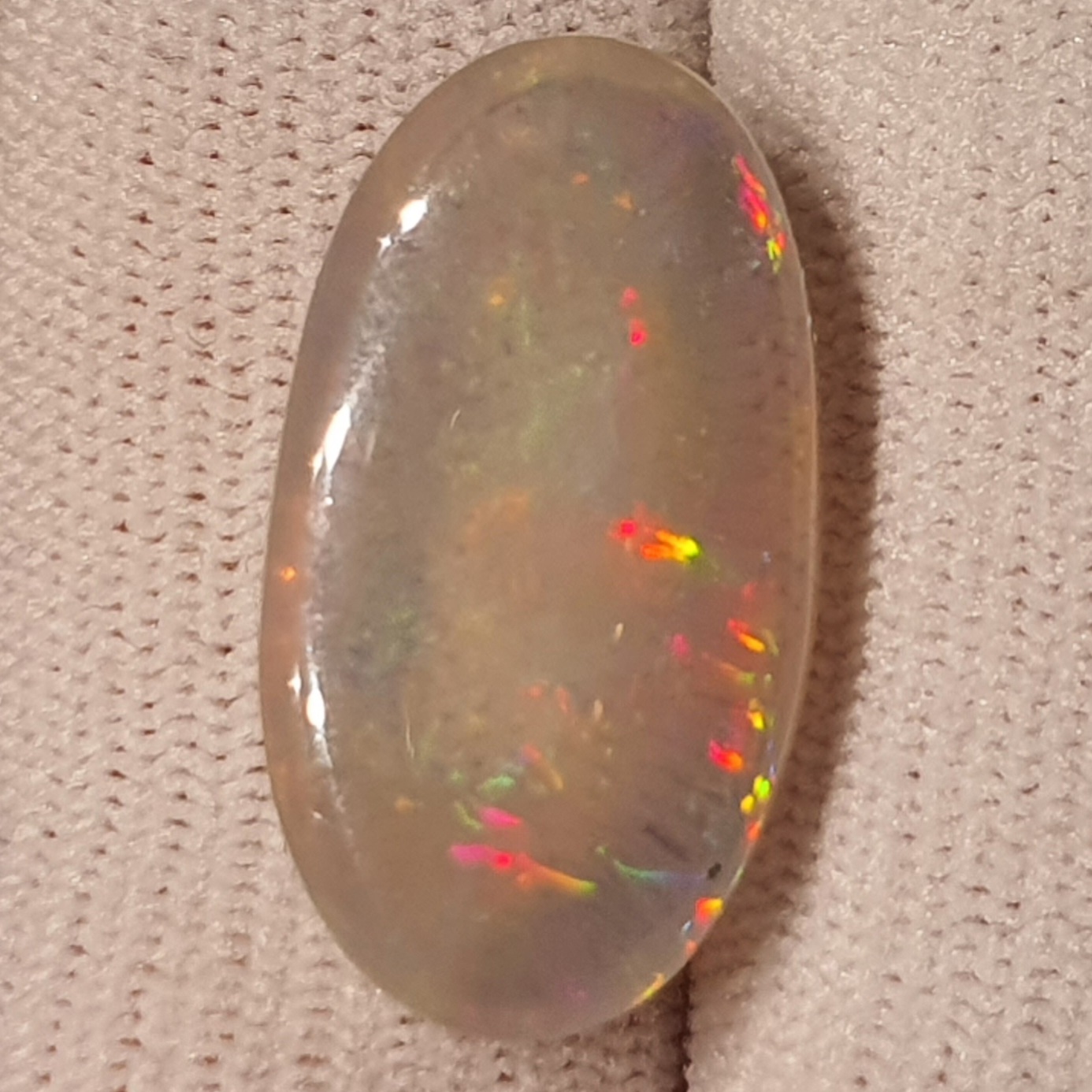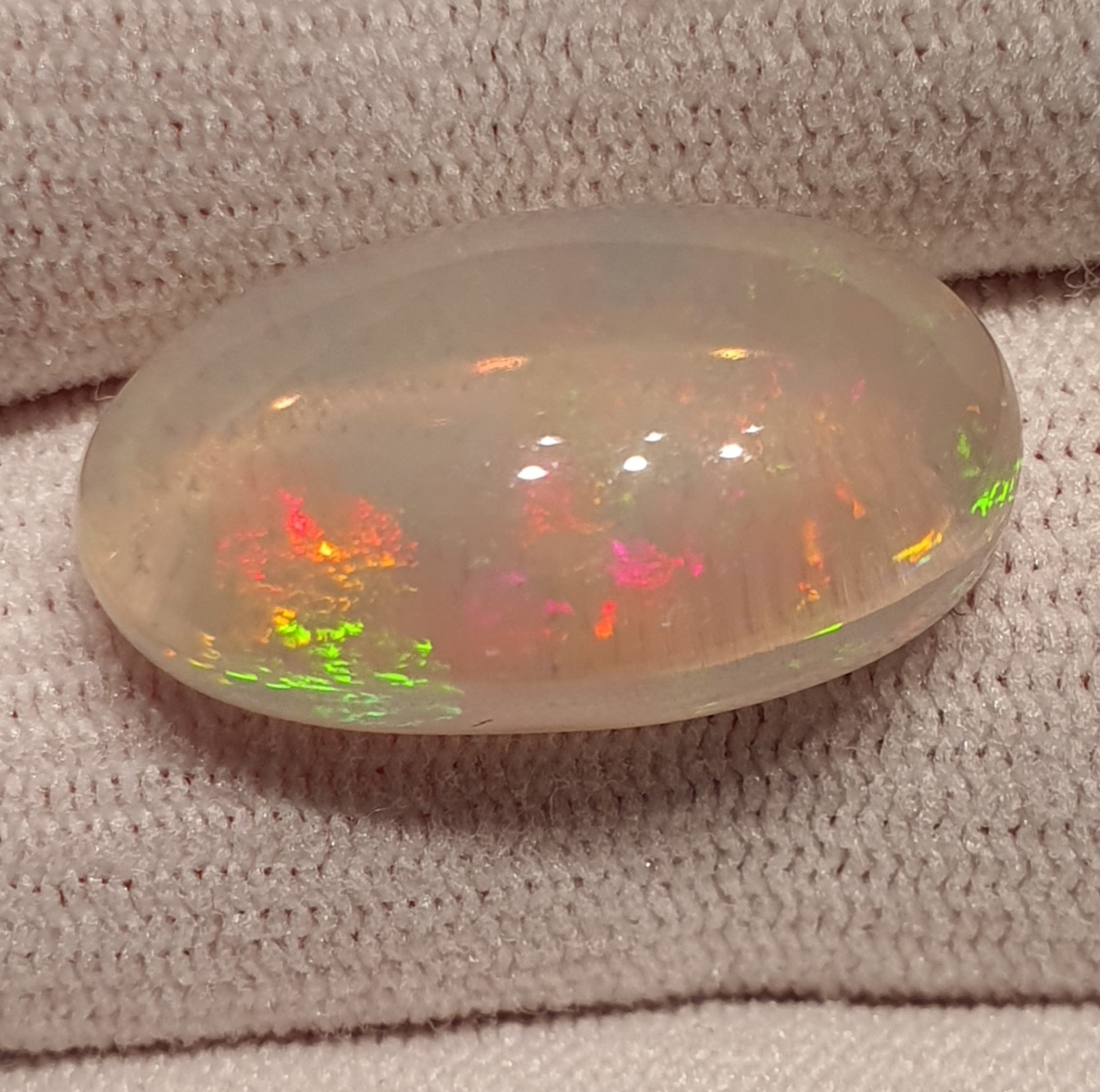 opal natural transparent, de 13.56 carate, fatetat caboson oval, potrivit pentru pandantiv, cu dimensiunile: 23 x 12,6 x 7,6mm; prezinta iridescenta multicolora foarte buna pe o jumatate verticala si iridescenta multicolora mai discreta pe cealalta jumatate verticala