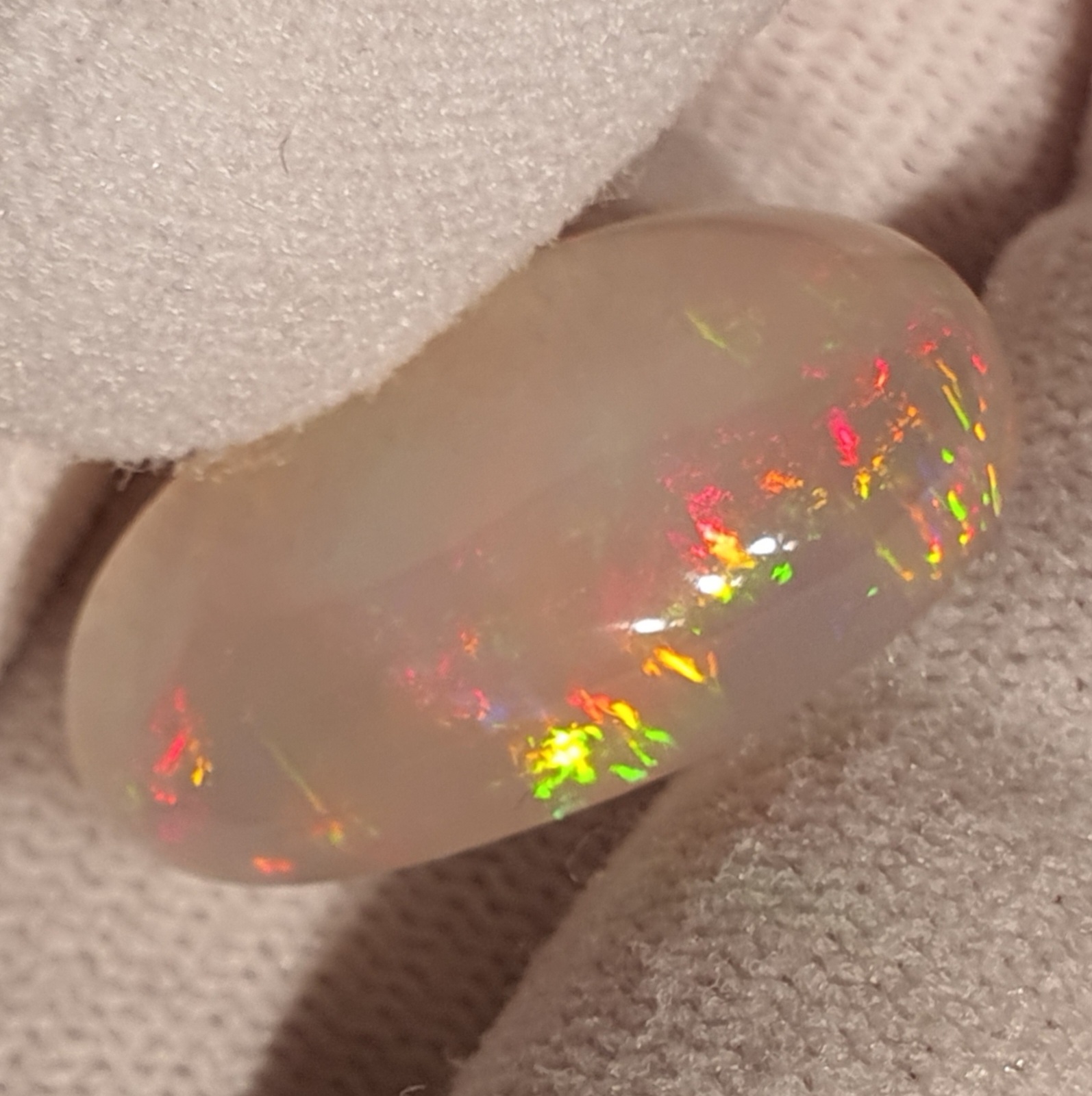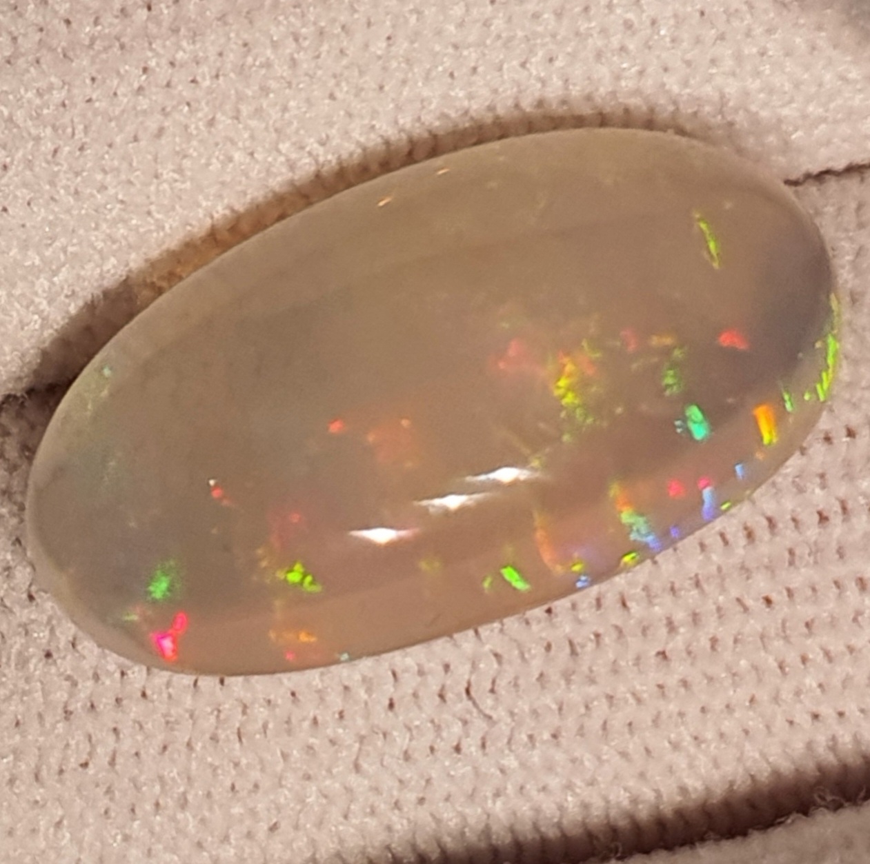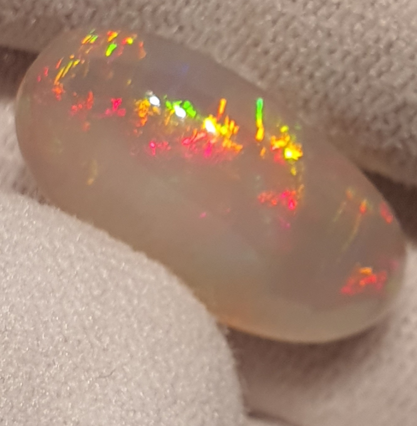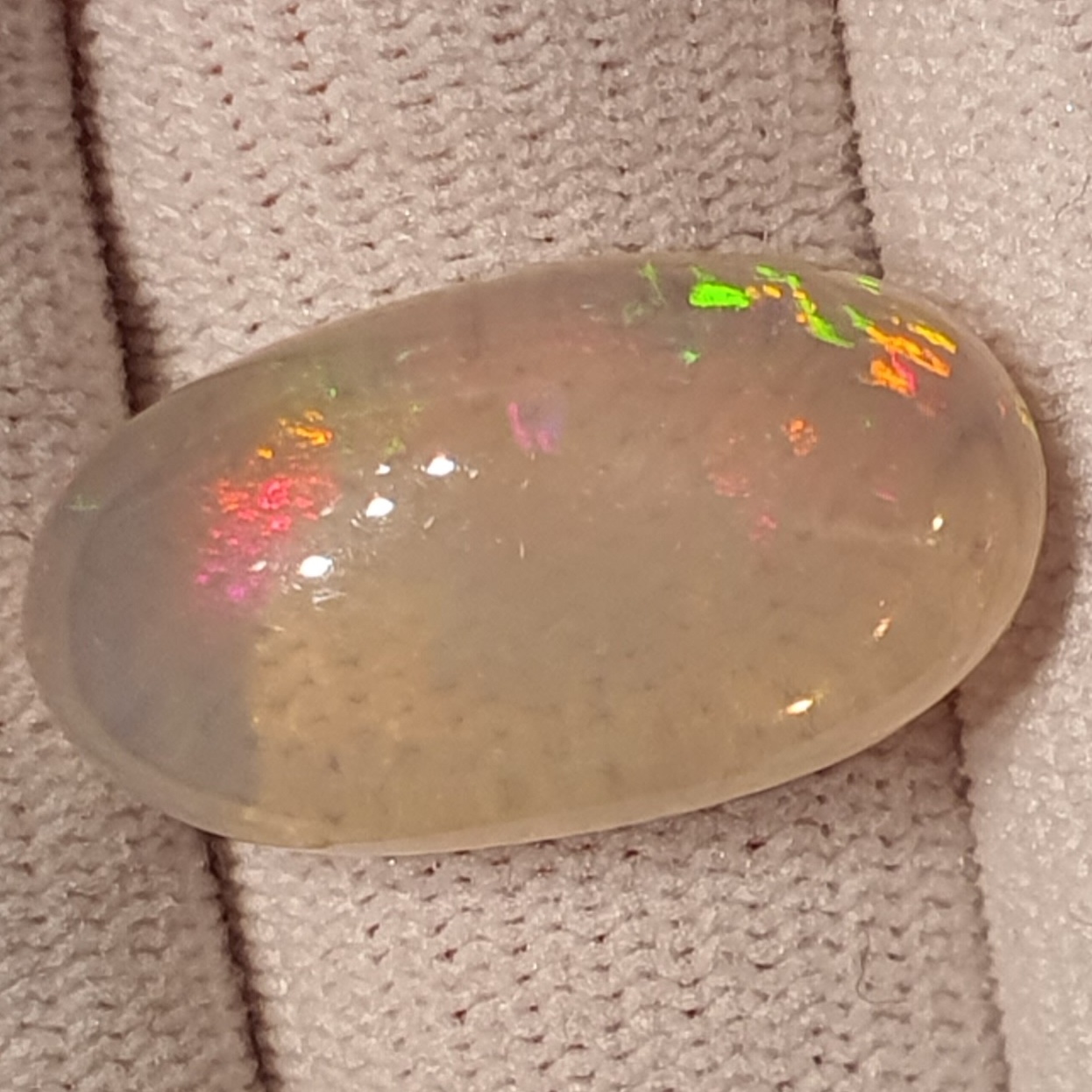 opal natural transparent, de 13.56 carate, fatetat caboson oval, potrivit pentru pandantiv, cu dimensiunile: 23 x 12,6 x 7,6mm; prezinta iridescenta multicolora foarte buna pe o jumatate verticala si iridescenta multicolora mai discreta pe cealalta jumatate verticala