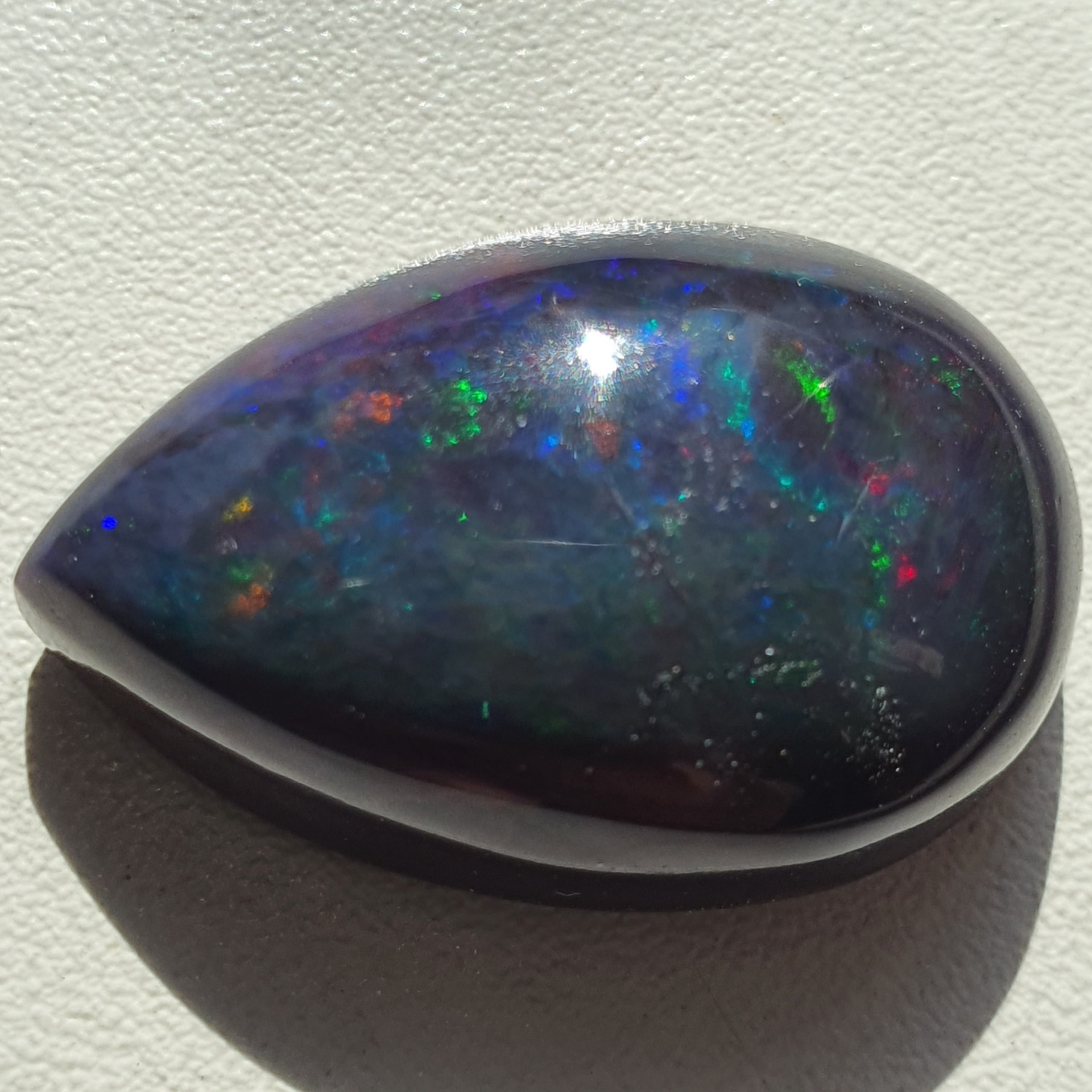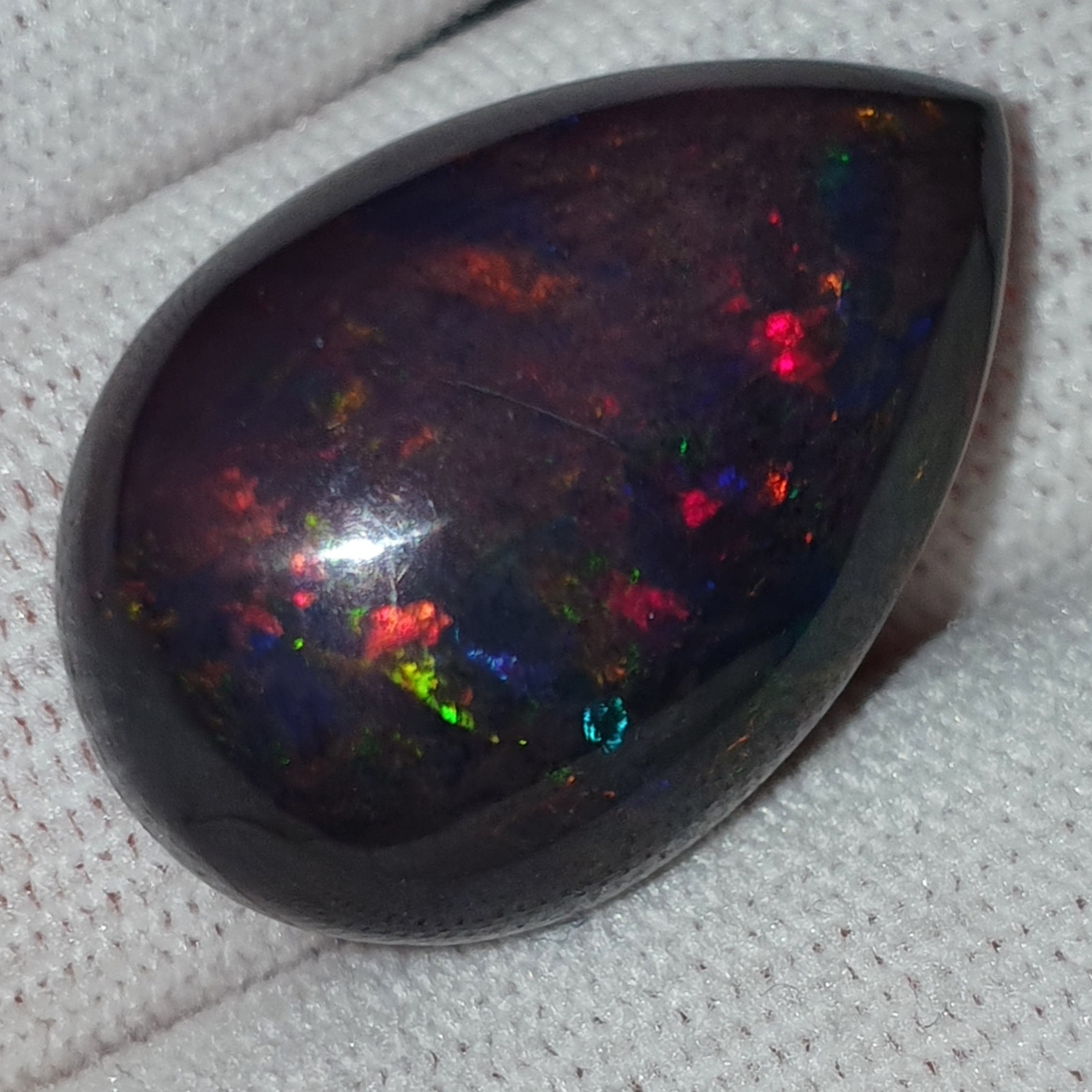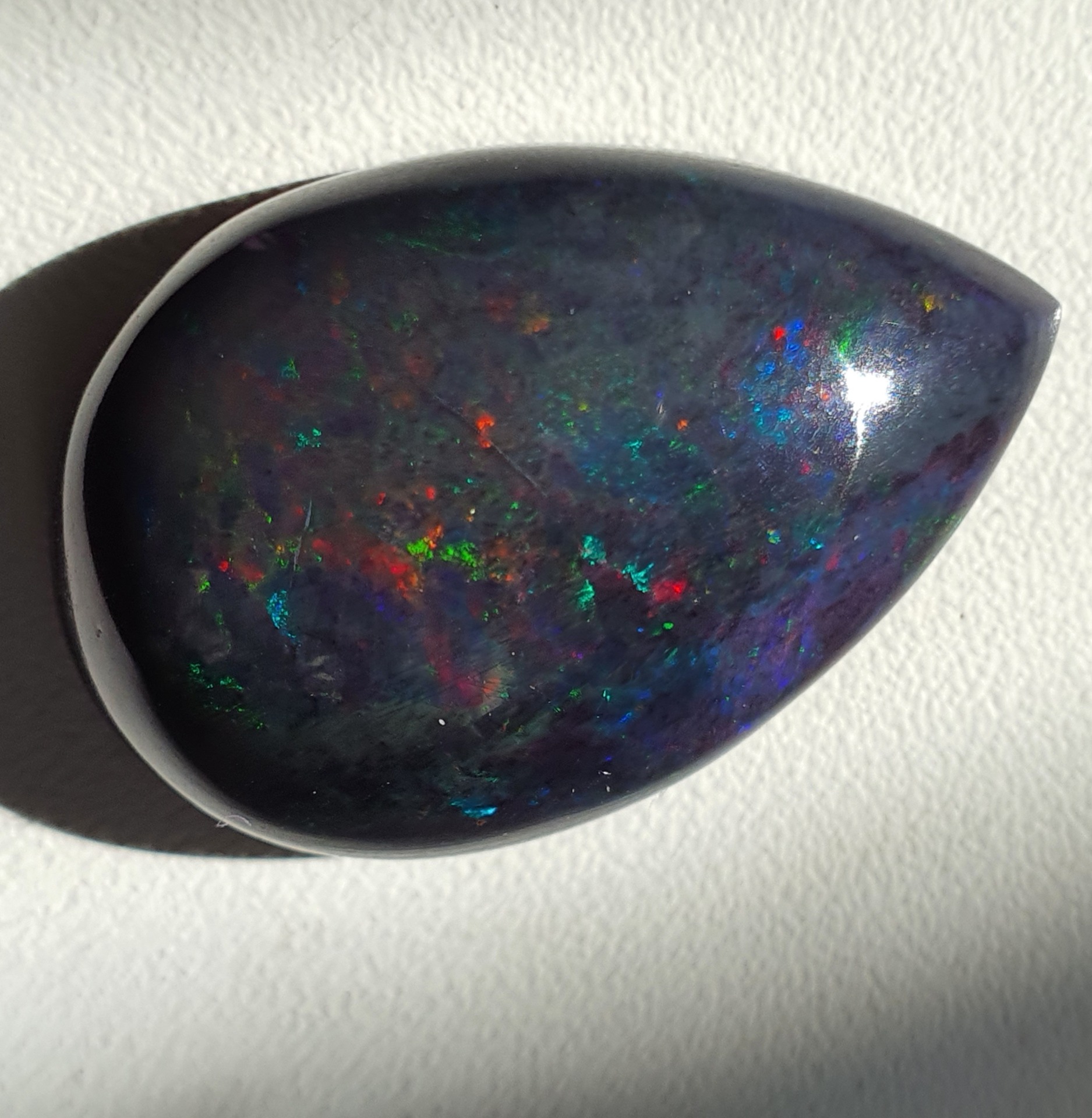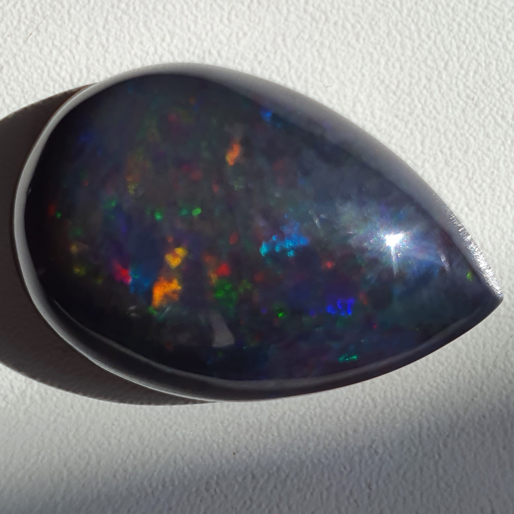 opal natural negru cu irizatii multicolore (albastre, verzi, violet, magenta, rosii, galbene), tratat standard (afumat), in greutate de 19.70 carate, slefuit picatura caboson de mari dimensiuni: 25.62 x 17.12 x 8.82mm