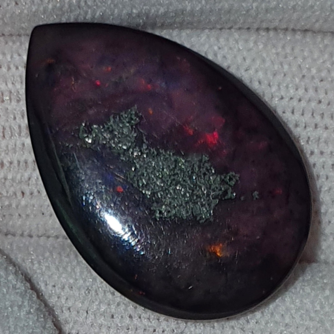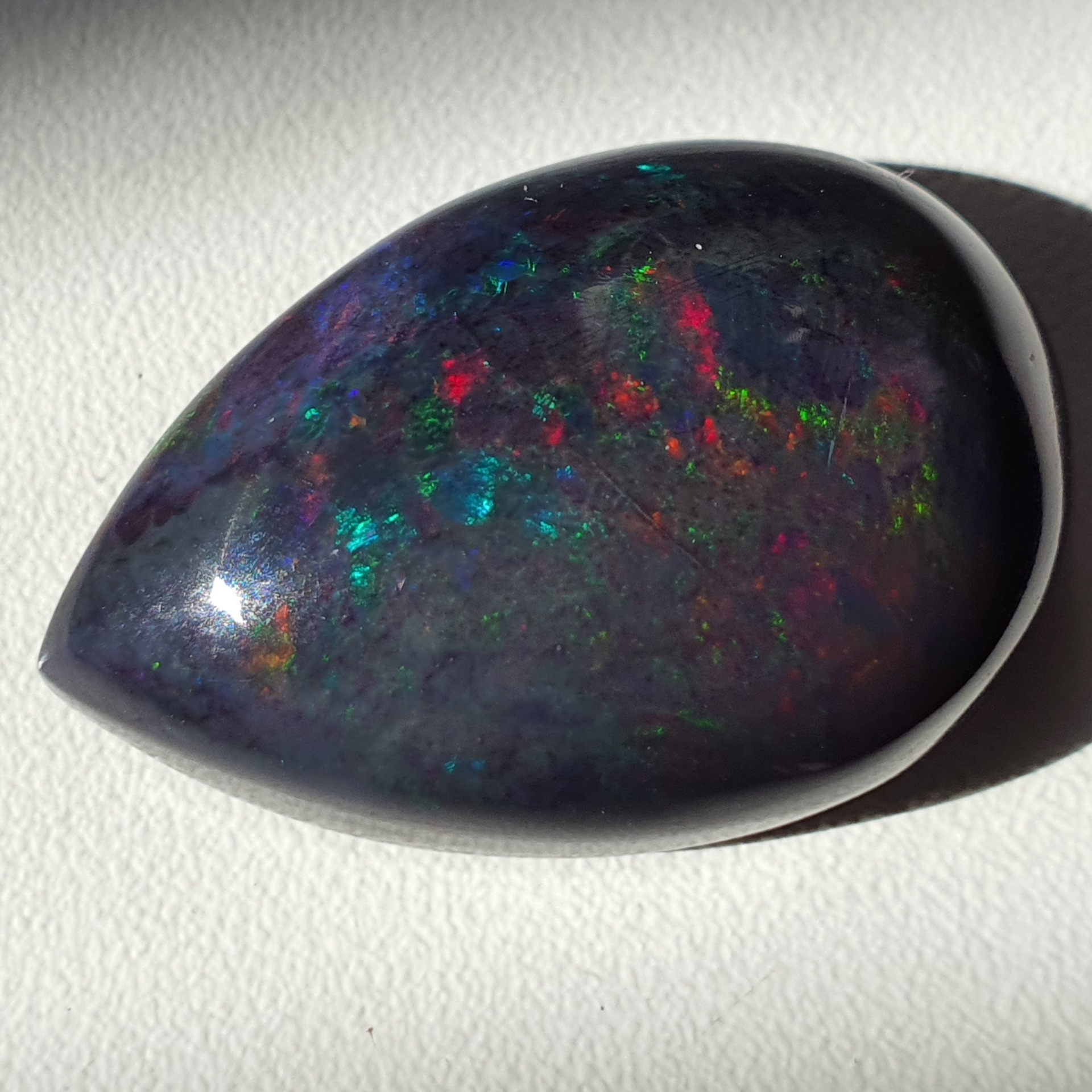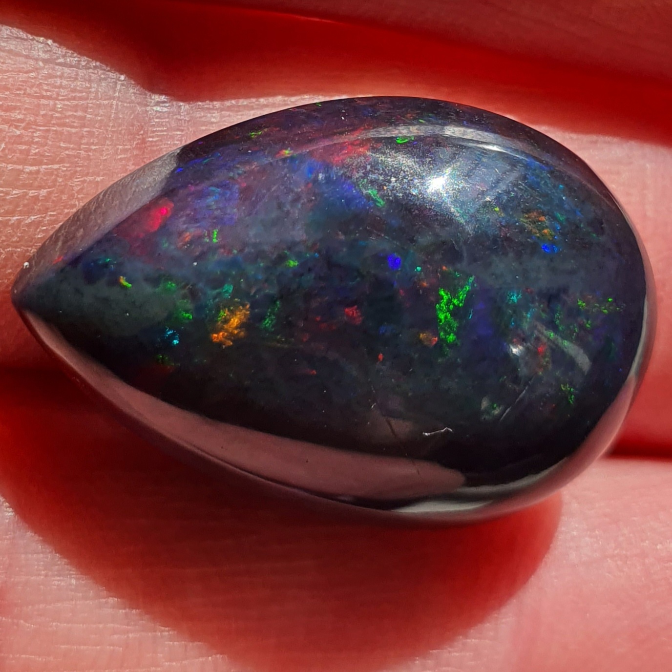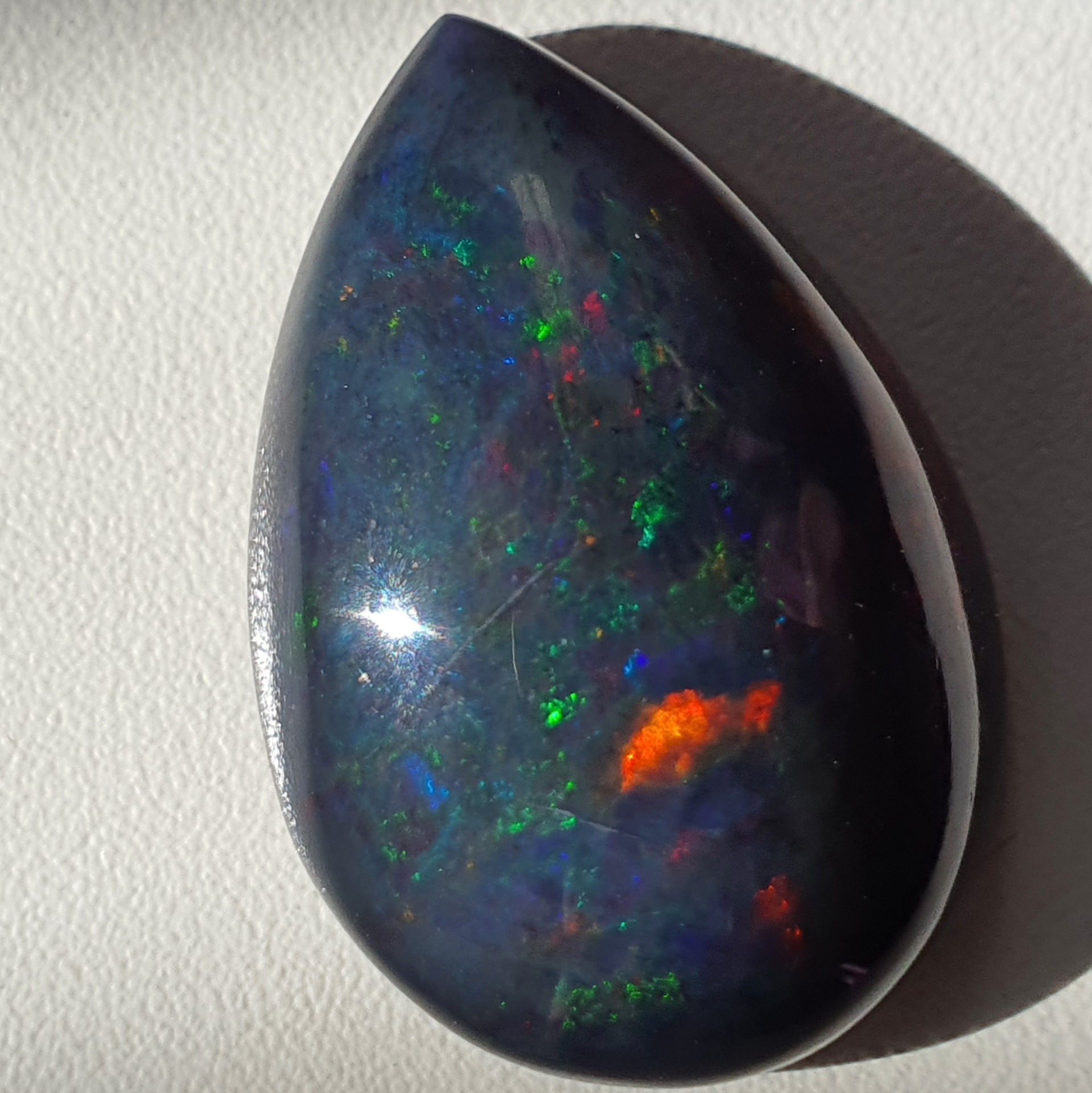opal natural negru cu irizatii multicolore (albastre, verzi, violet, magenta, rosii, galbene), tratat standard (afumat), in greutate de 19.70 carate, slefuit picatura caboson de mari dimensiuni: 25.62 x 17.12 x 8.82mm