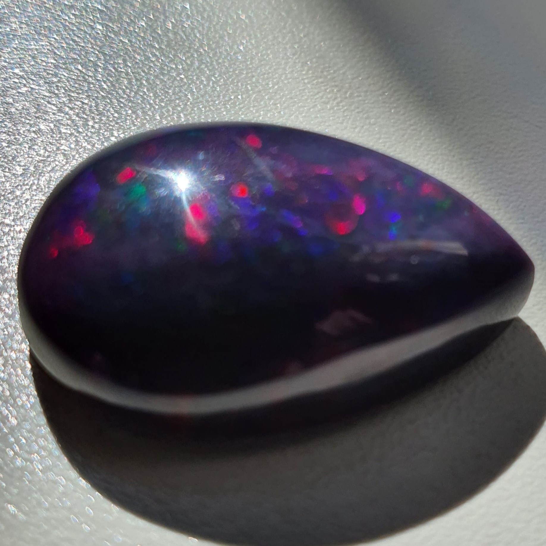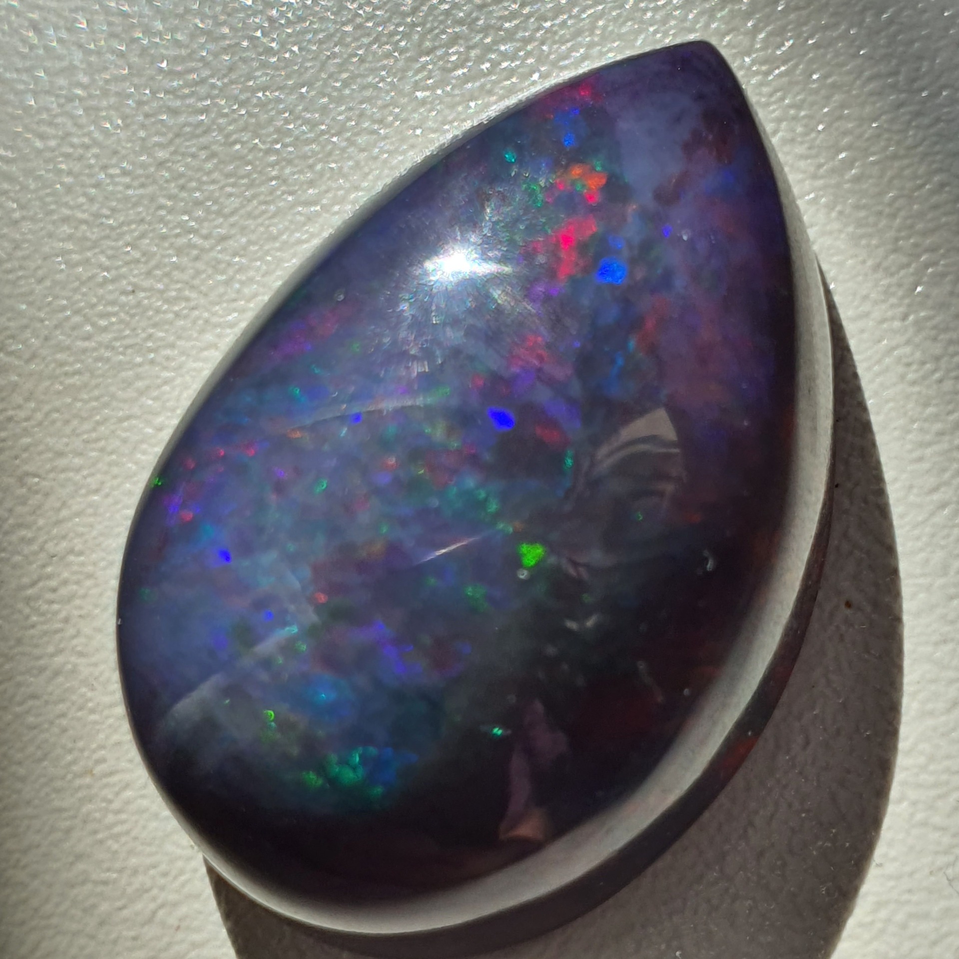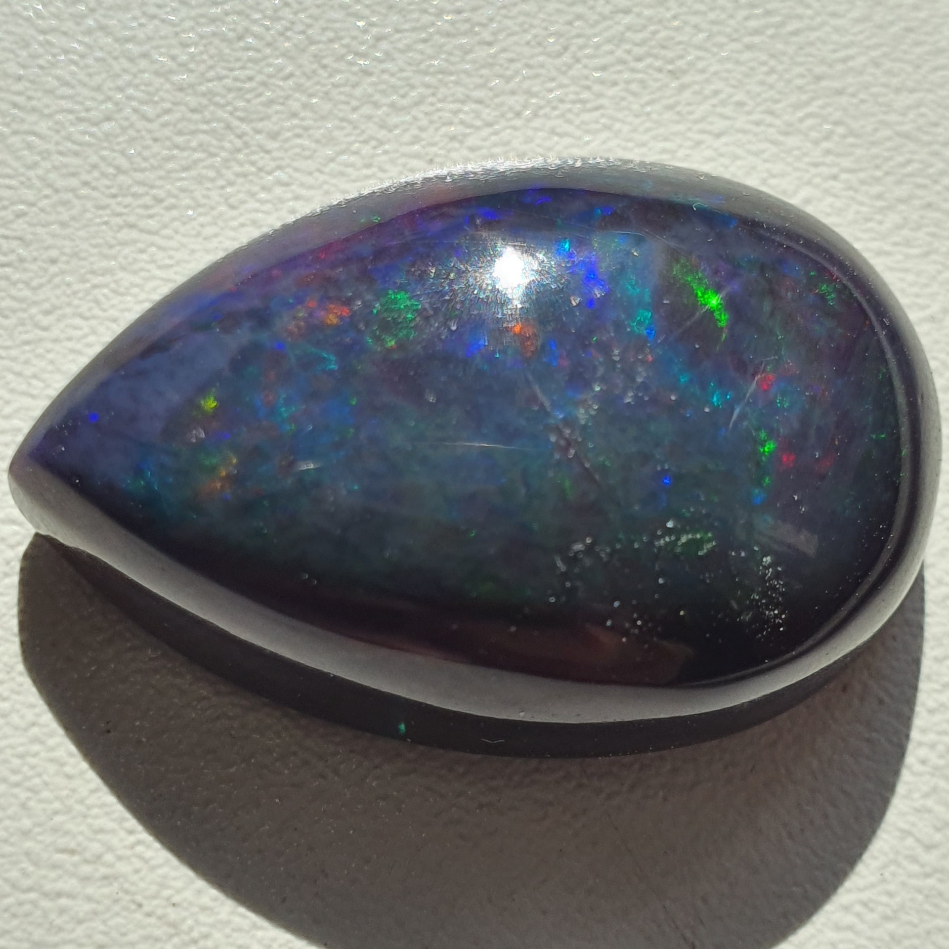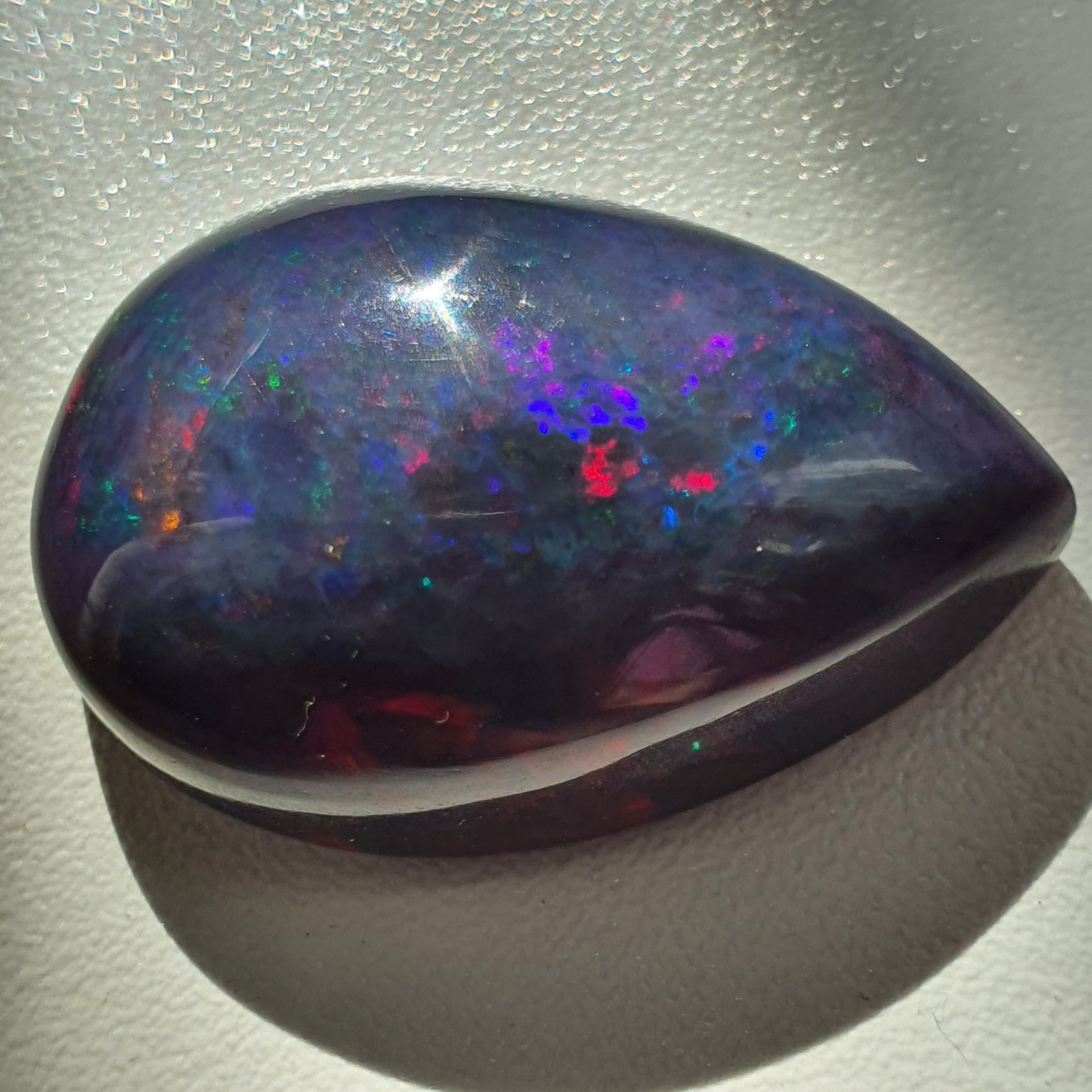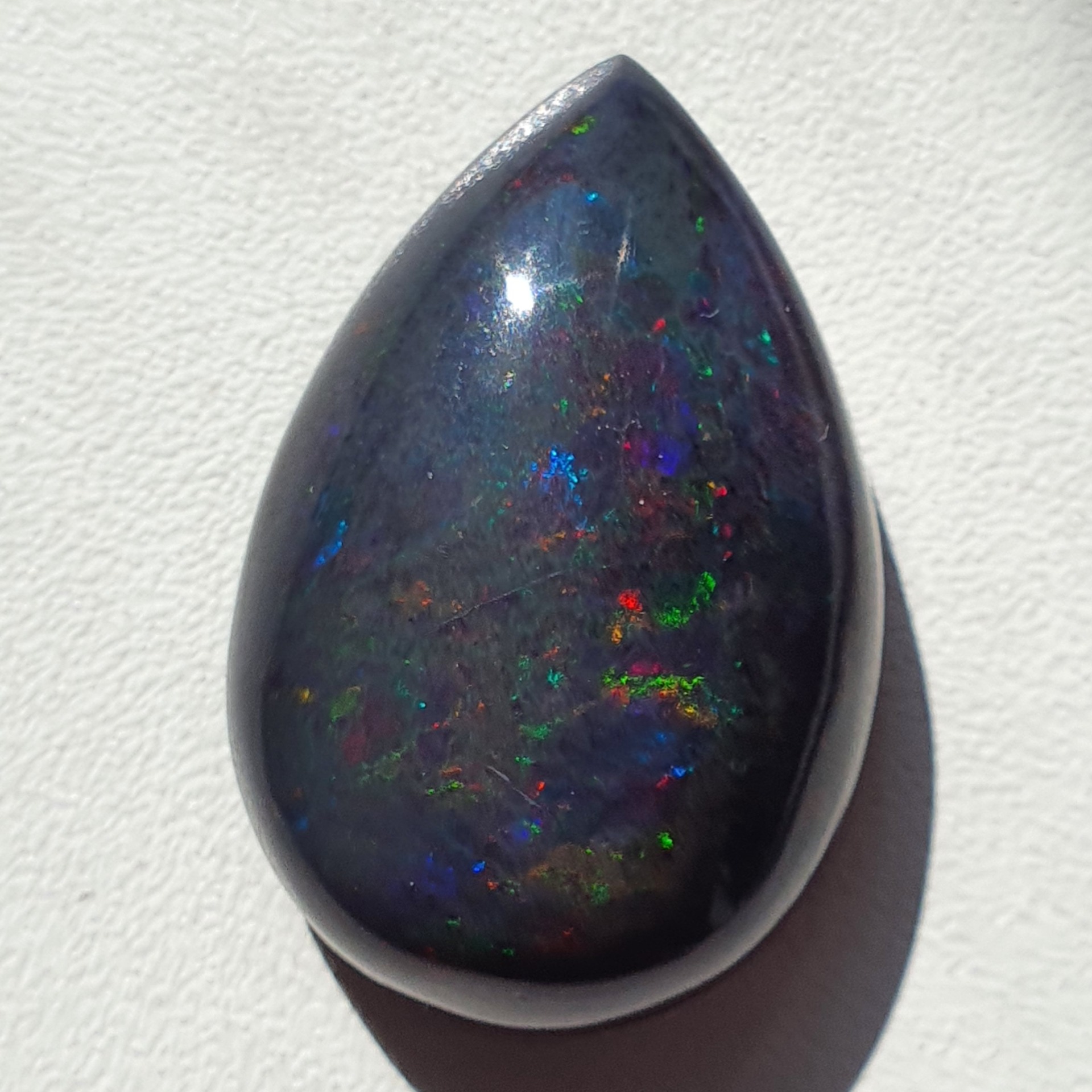 opal natural negru cu irizatii multicolore (albastre, verzi, violet, magenta, rosii, galbene), tratat standard (afumat), in greutate de 19.70 carate, slefuit picatura caboson de mari dimensiuni: 25.62 x 17.12 x 8.82mm
