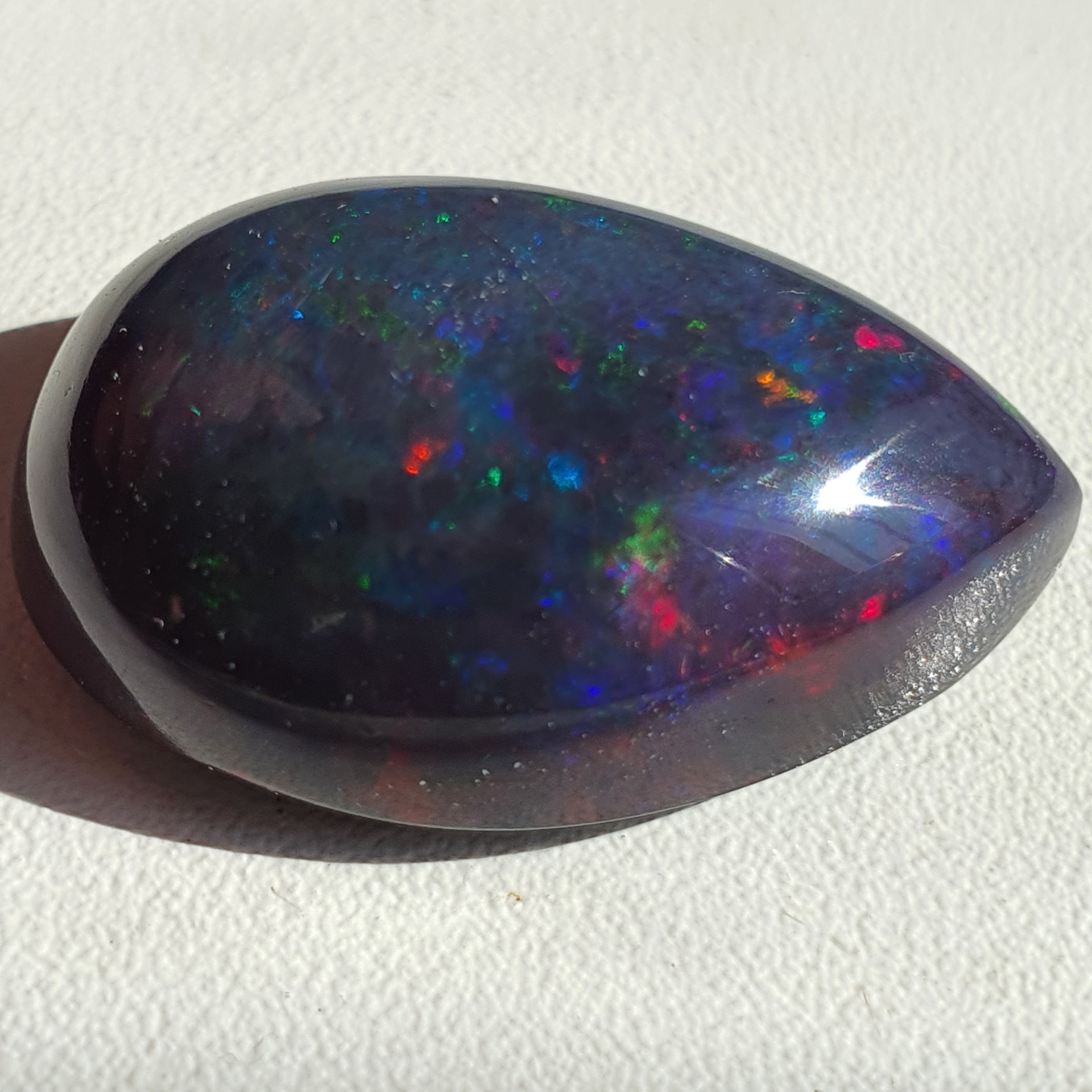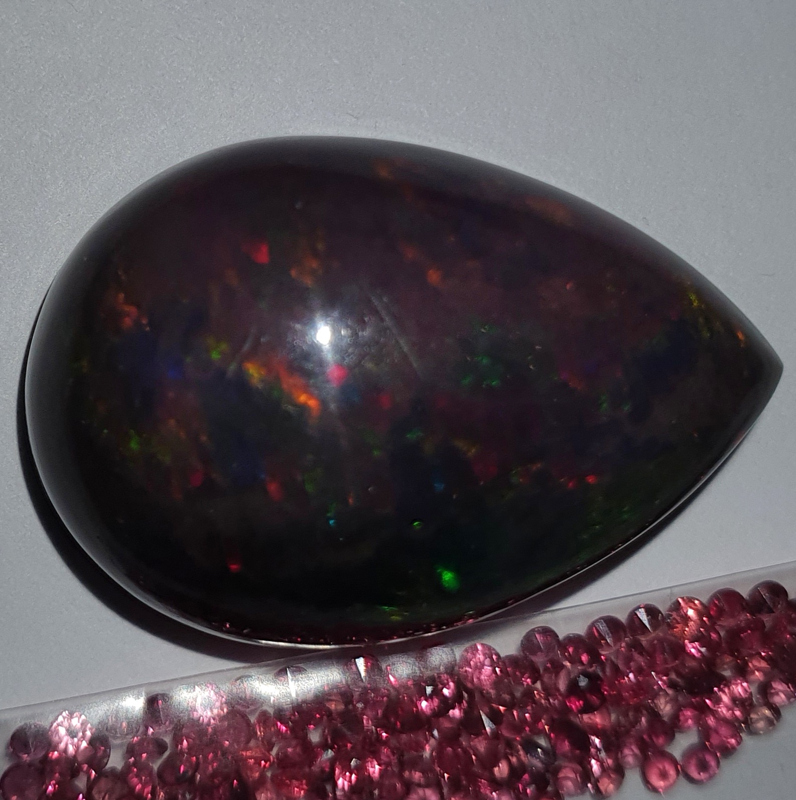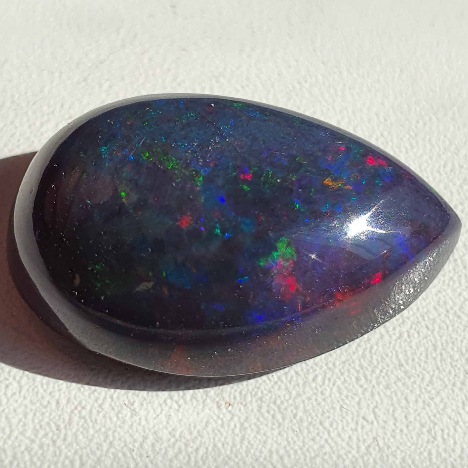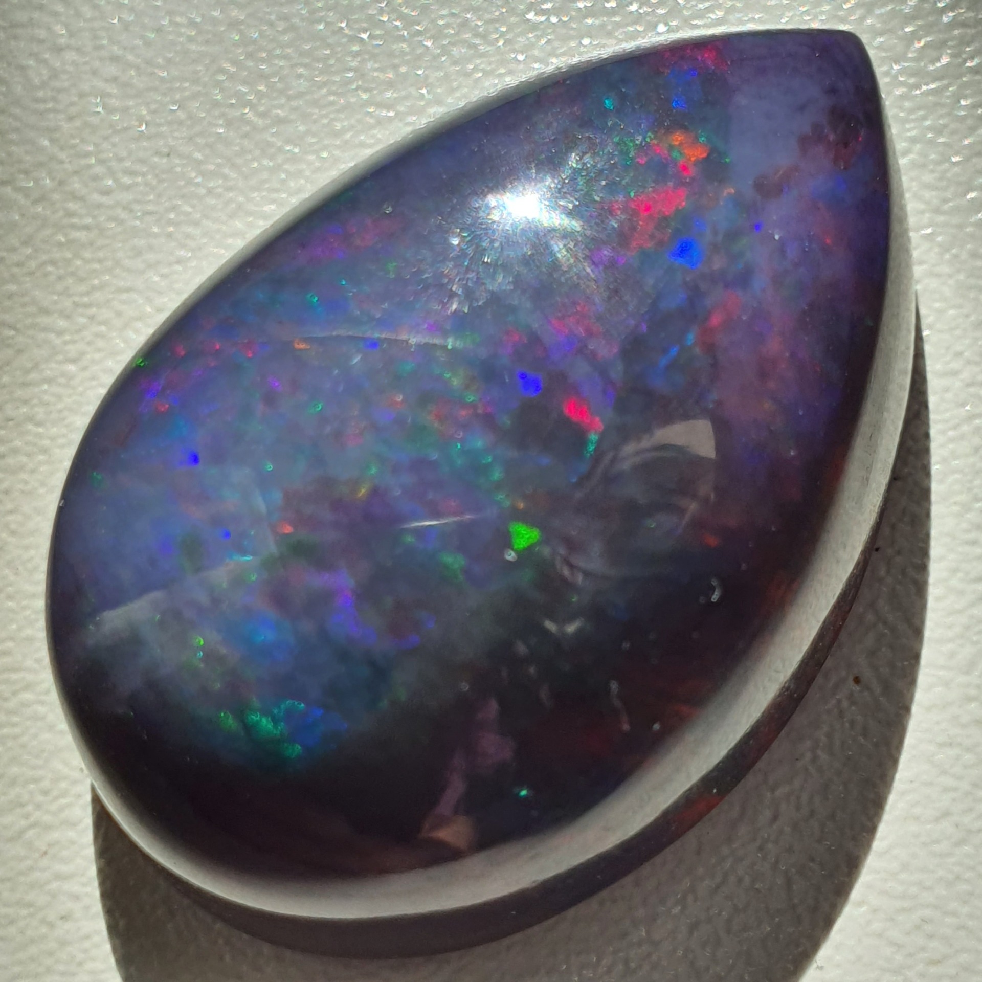 opal natural negru cu irizatii multicolore (albastre, verzi, violet, magenta, rosii, galbene), tratat standard (afumat), in greutate de 19.70 carate, slefuit picatura caboson de mari dimensiuni: 25.62 x 17.12 x 8.82mm