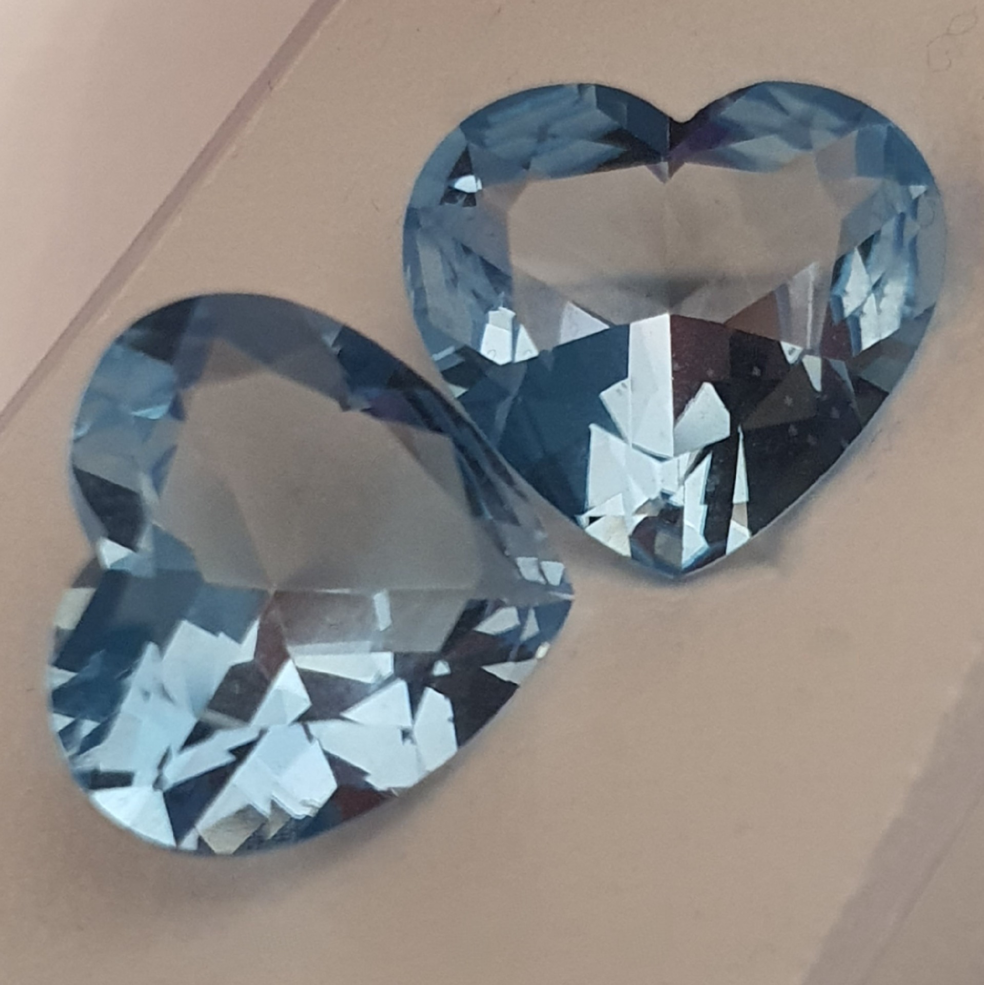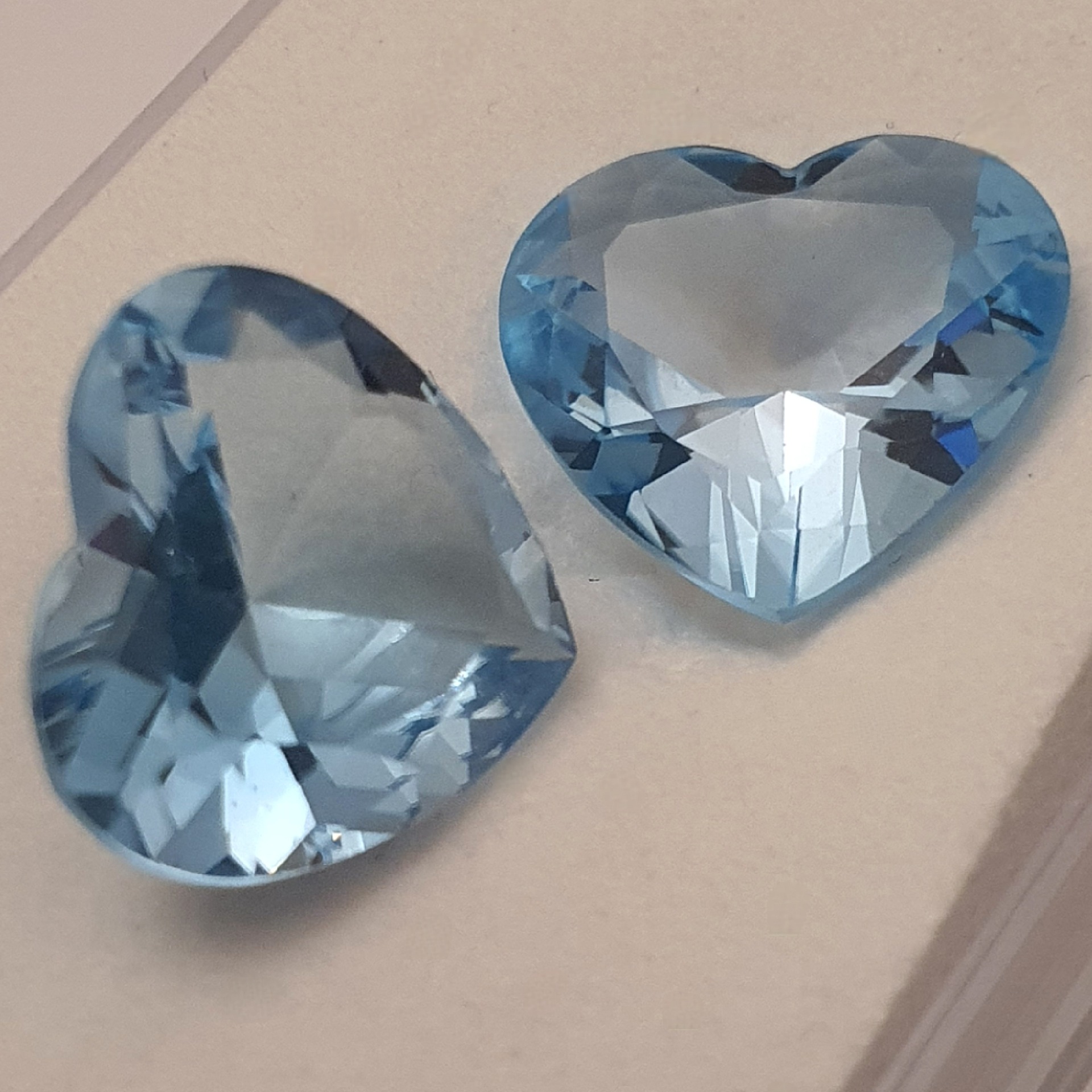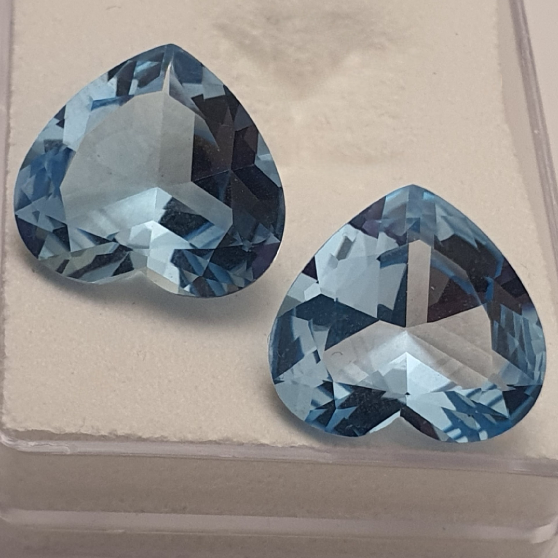 pereche topaze naturale in greutate de 21.16ct, clare si curate, tratate standard (iradiere), fatetate inimi cu dimensiunile 15.5 x 14.5mm