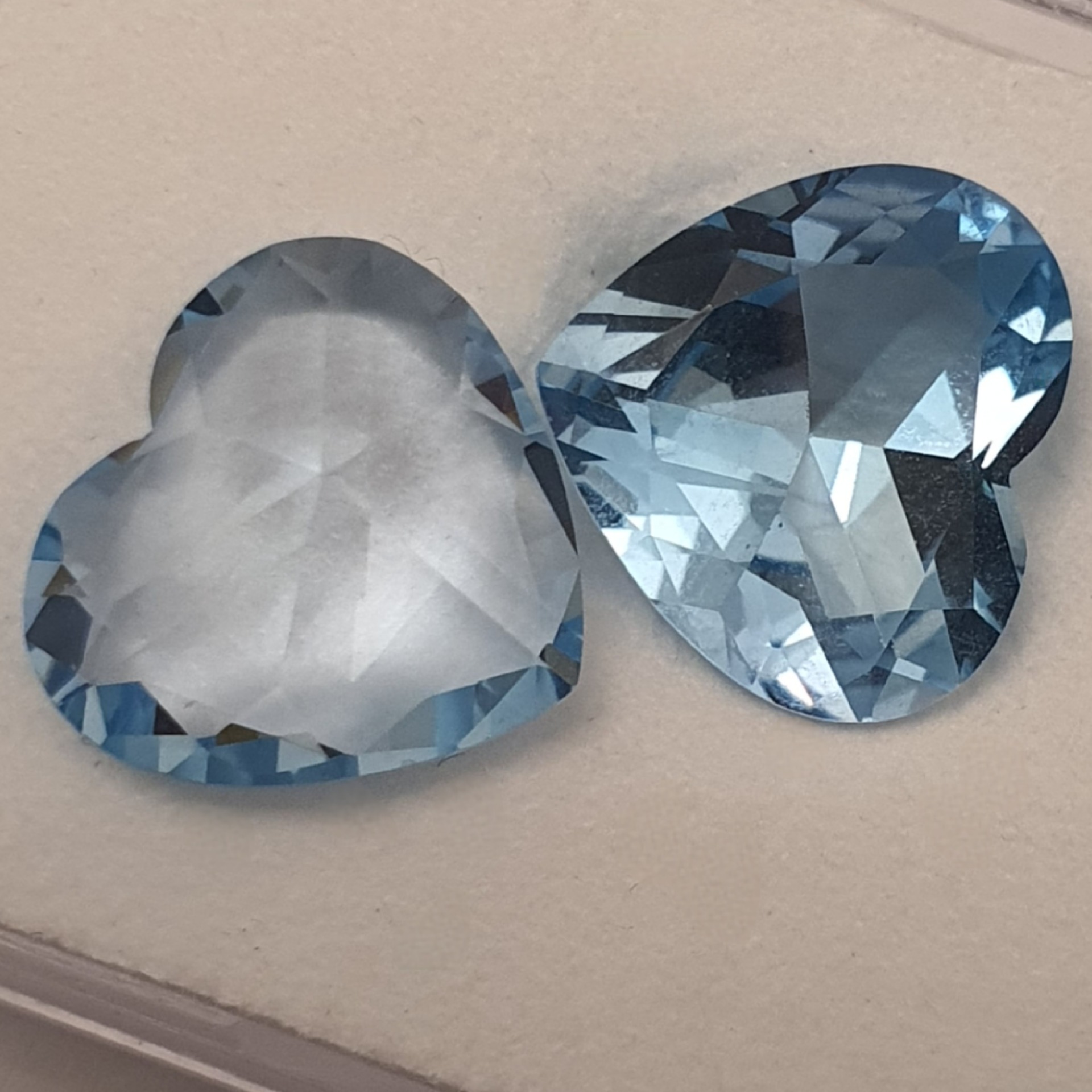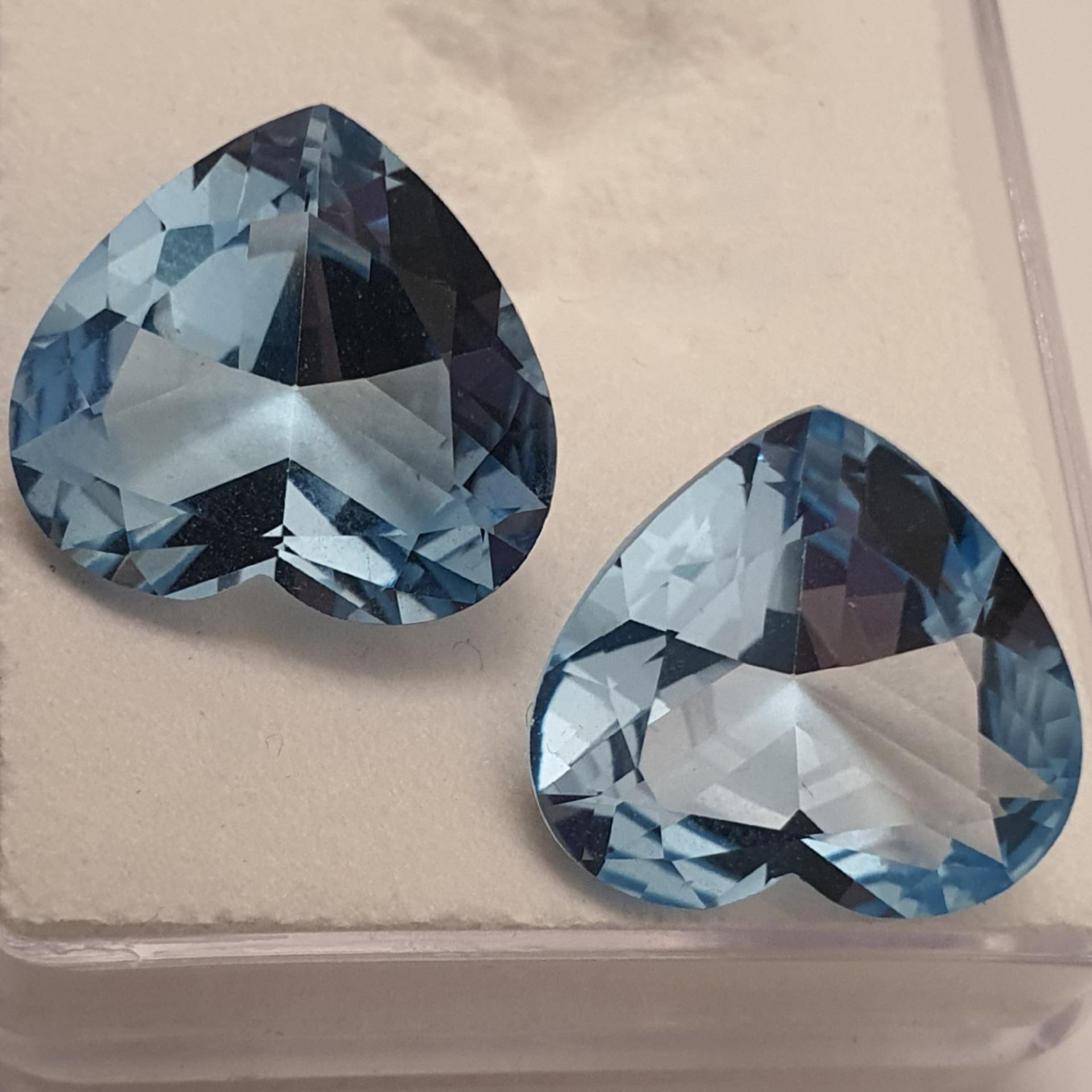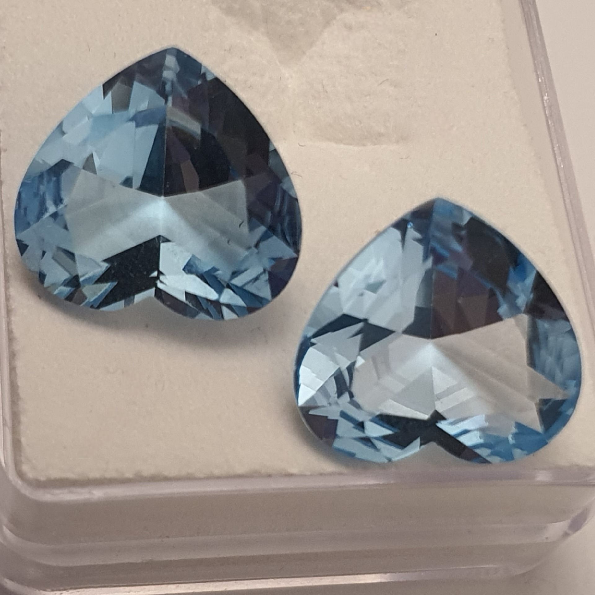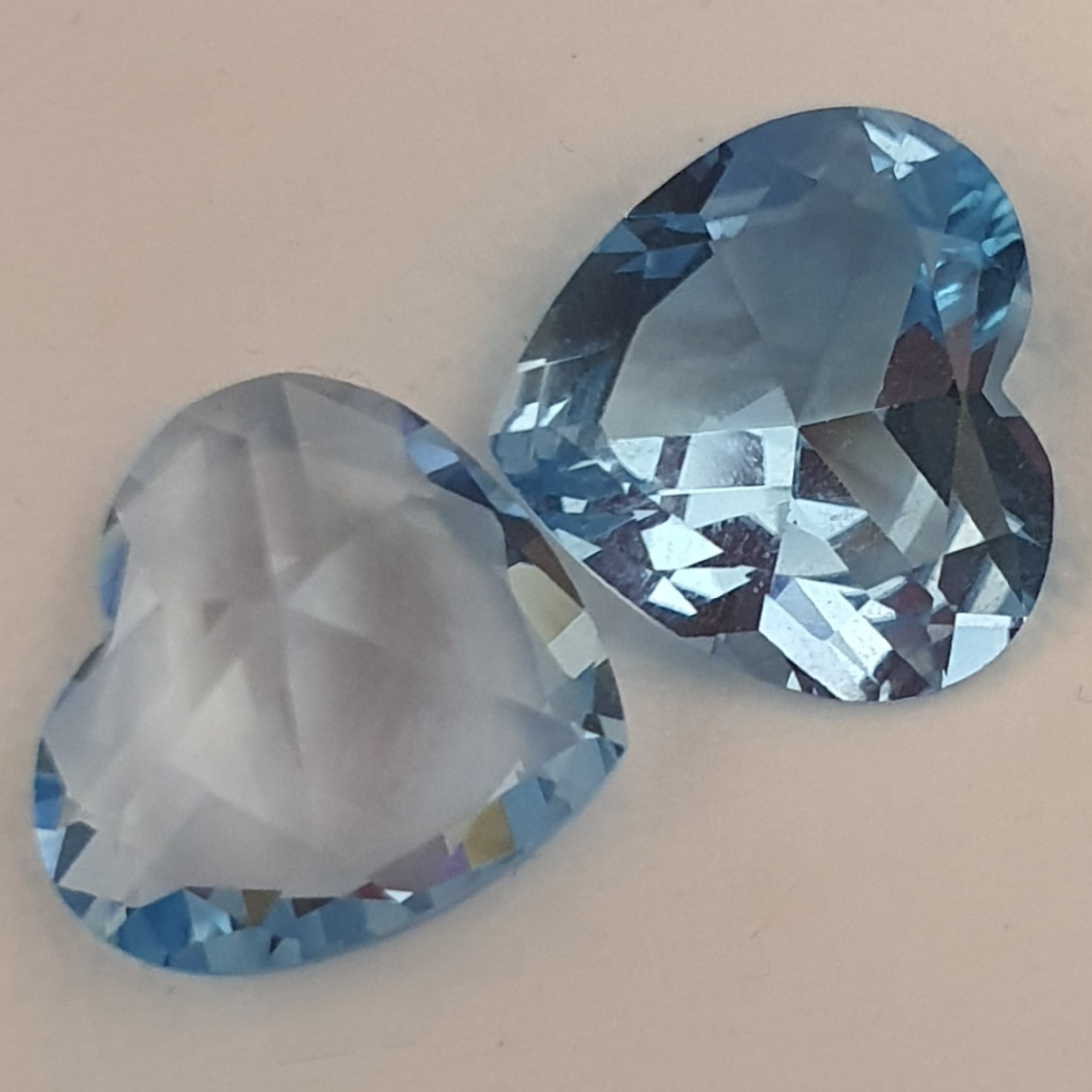 pereche topaze naturale in greutate de 21.16ct, clare si curate, tratate standard (iradiere), fatetate inimi cu dimensiunile 15.5 x 14.5mm