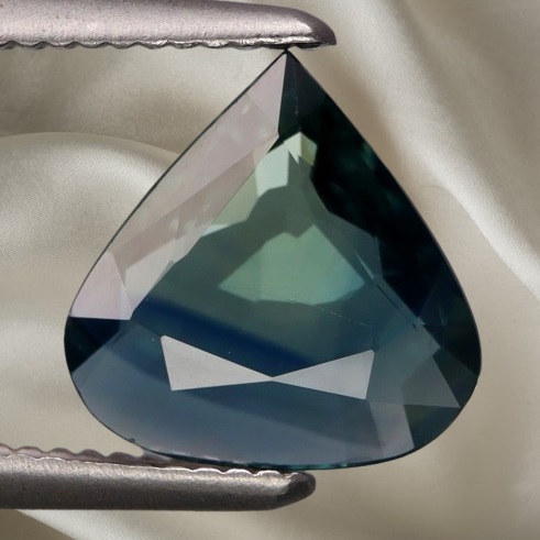 elegant safir natural australian, albastru - verzui, tratat standard (doar termic), in greutate de 1.42ct, de claritate VS curat, fatetat picatura, cu dimensiunile: 8.2 x 8.2 x 2.7mm