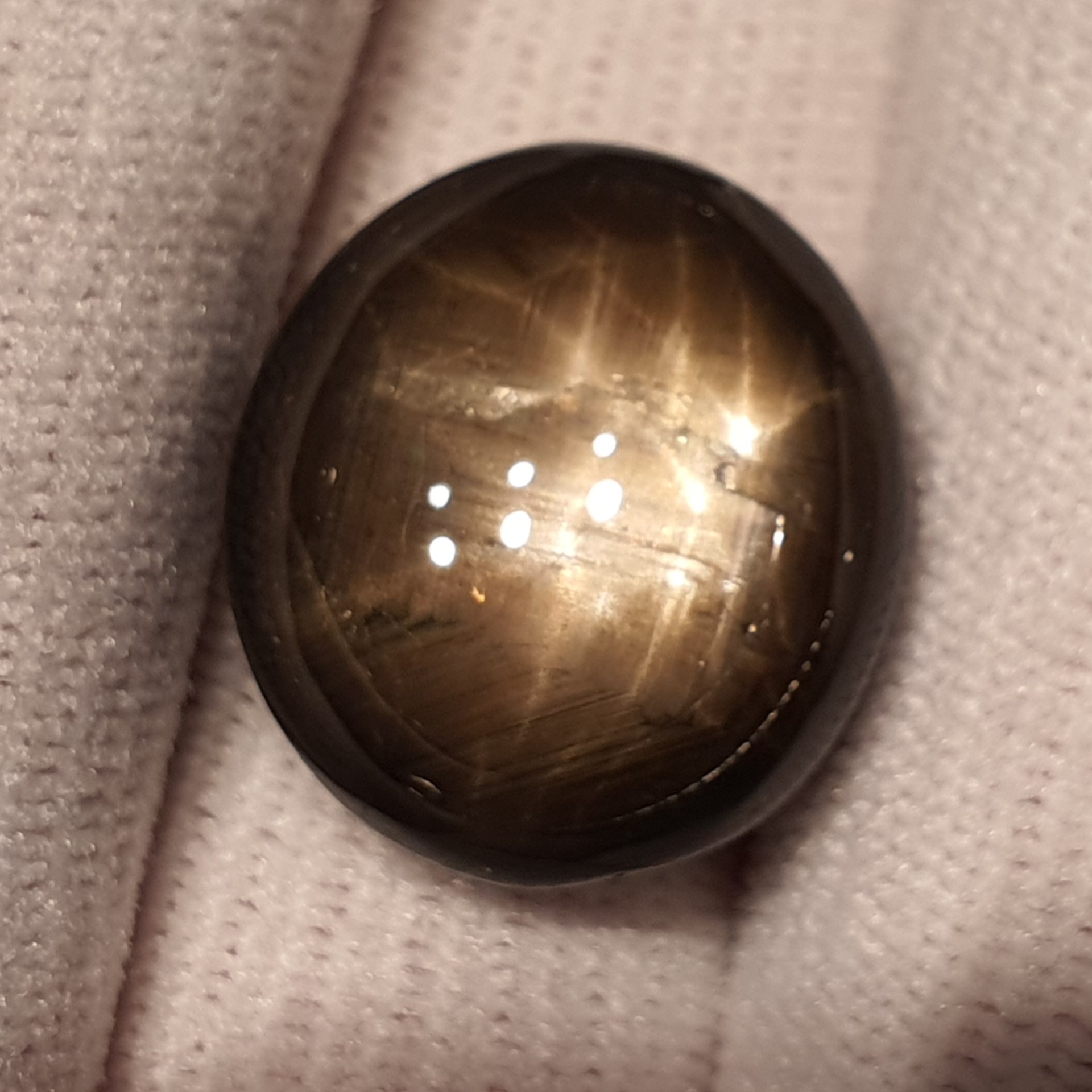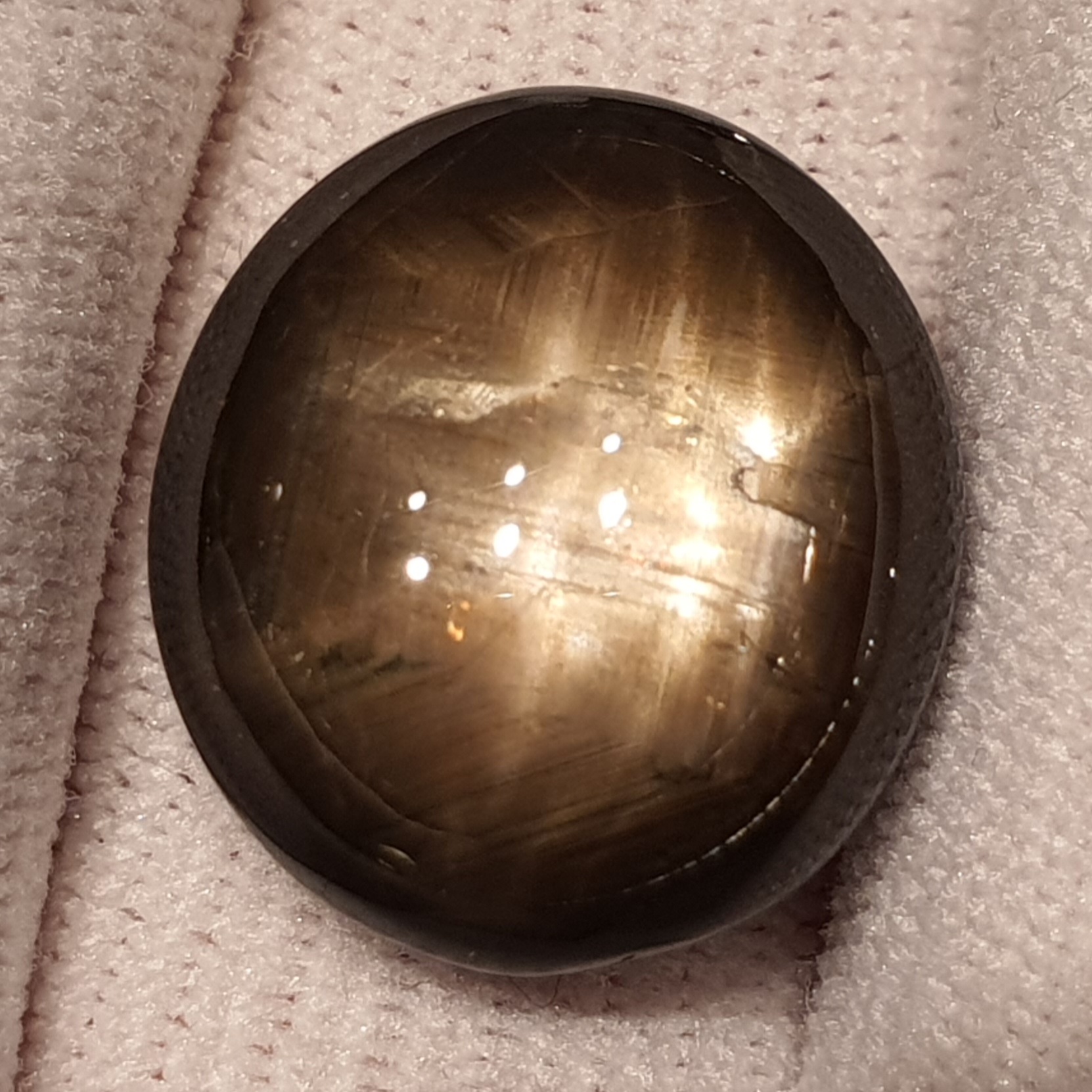 safir natural stelat netratat, opac, negru-maro-auriu, caboson oval de 29.27 carate si 17,5 x 15,9 x 8,5mm