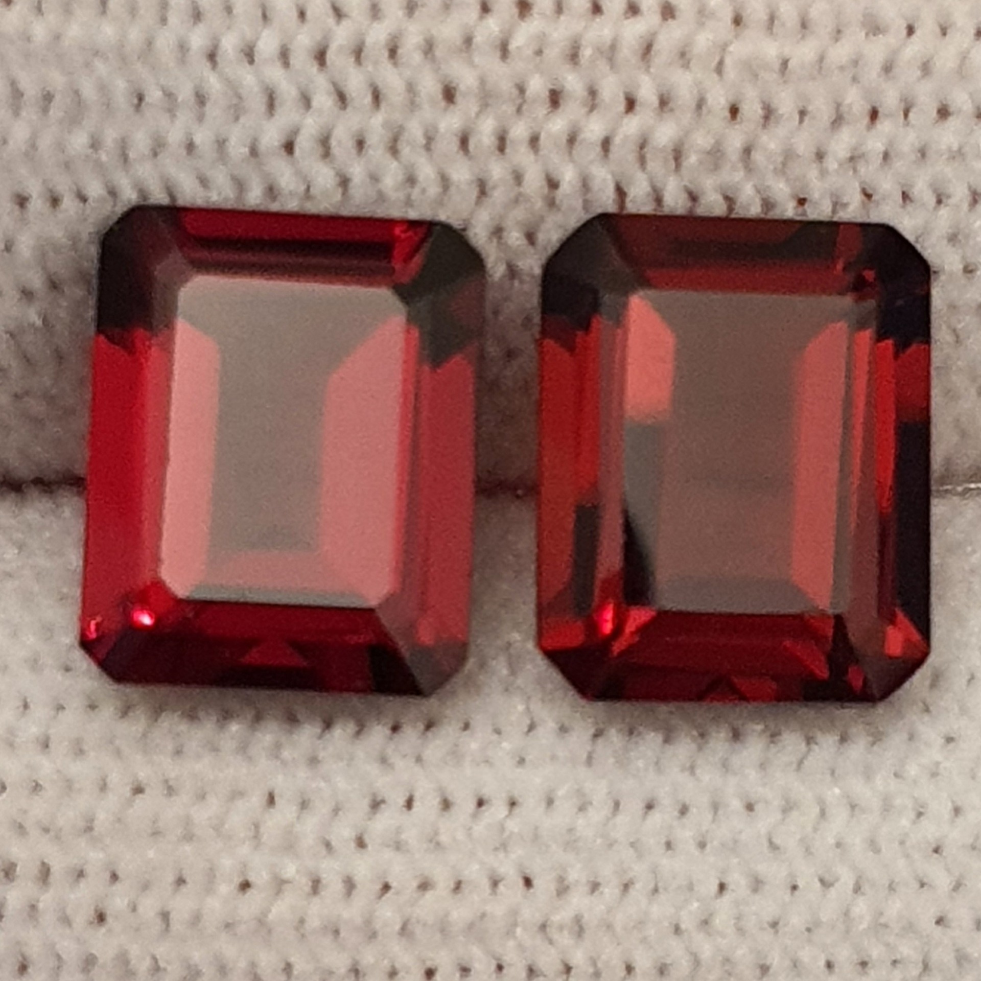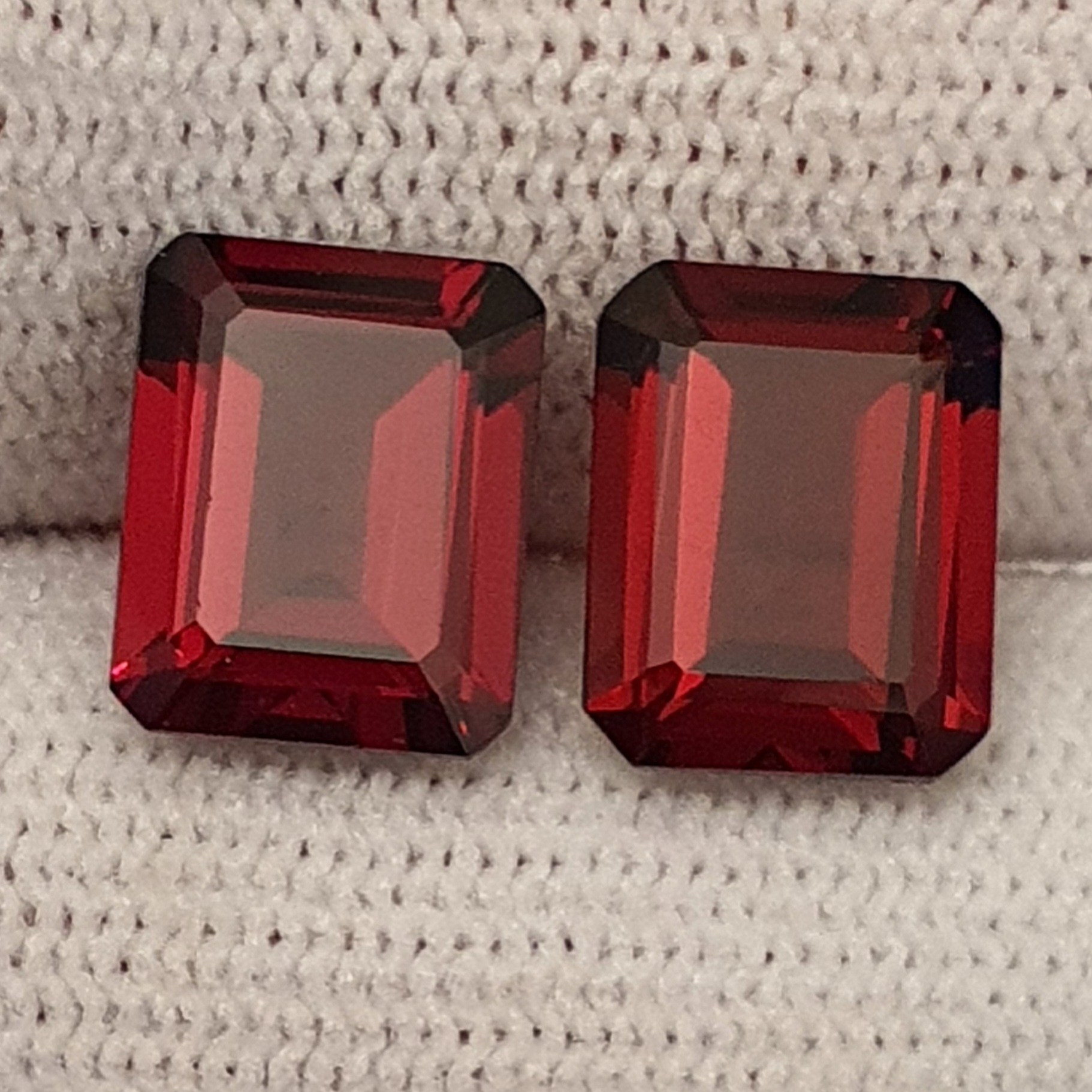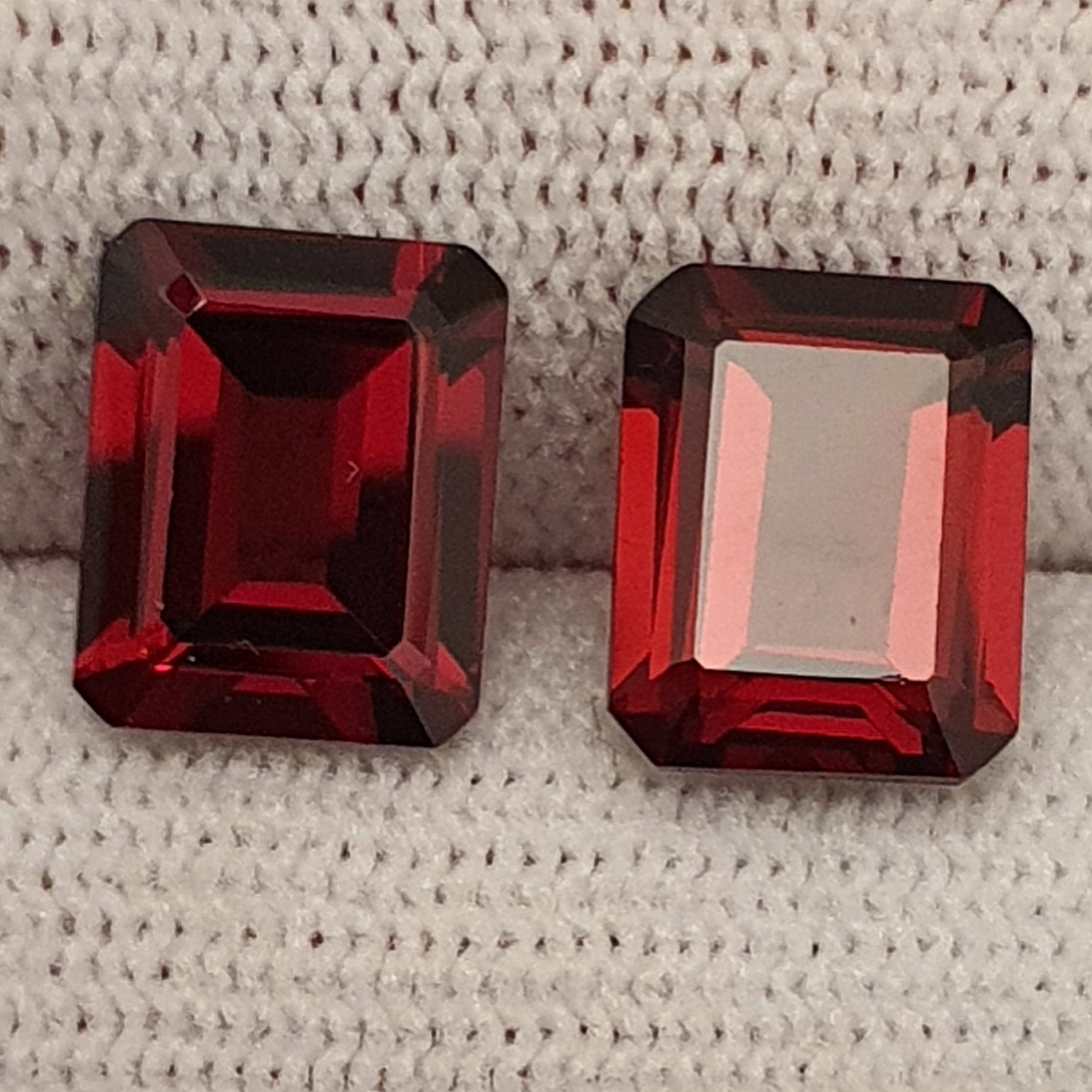 pereche granate naturale rosii in greutate de 7.36 carate, fatetate dreptunghi cu colturile taiate (octogon), cu dimensiunile 10 x 8mm; granatele sunt deosebit de frumoase si elegante