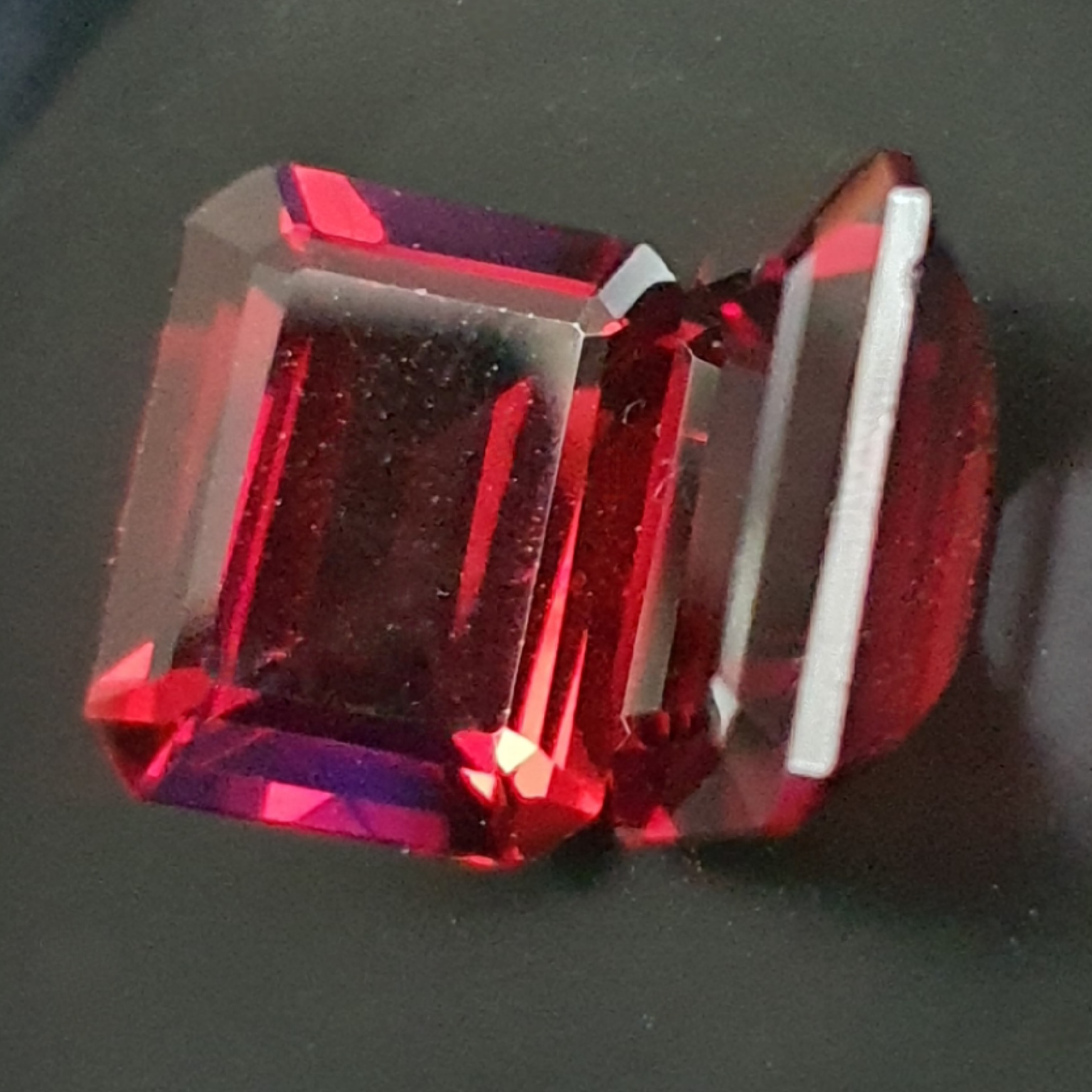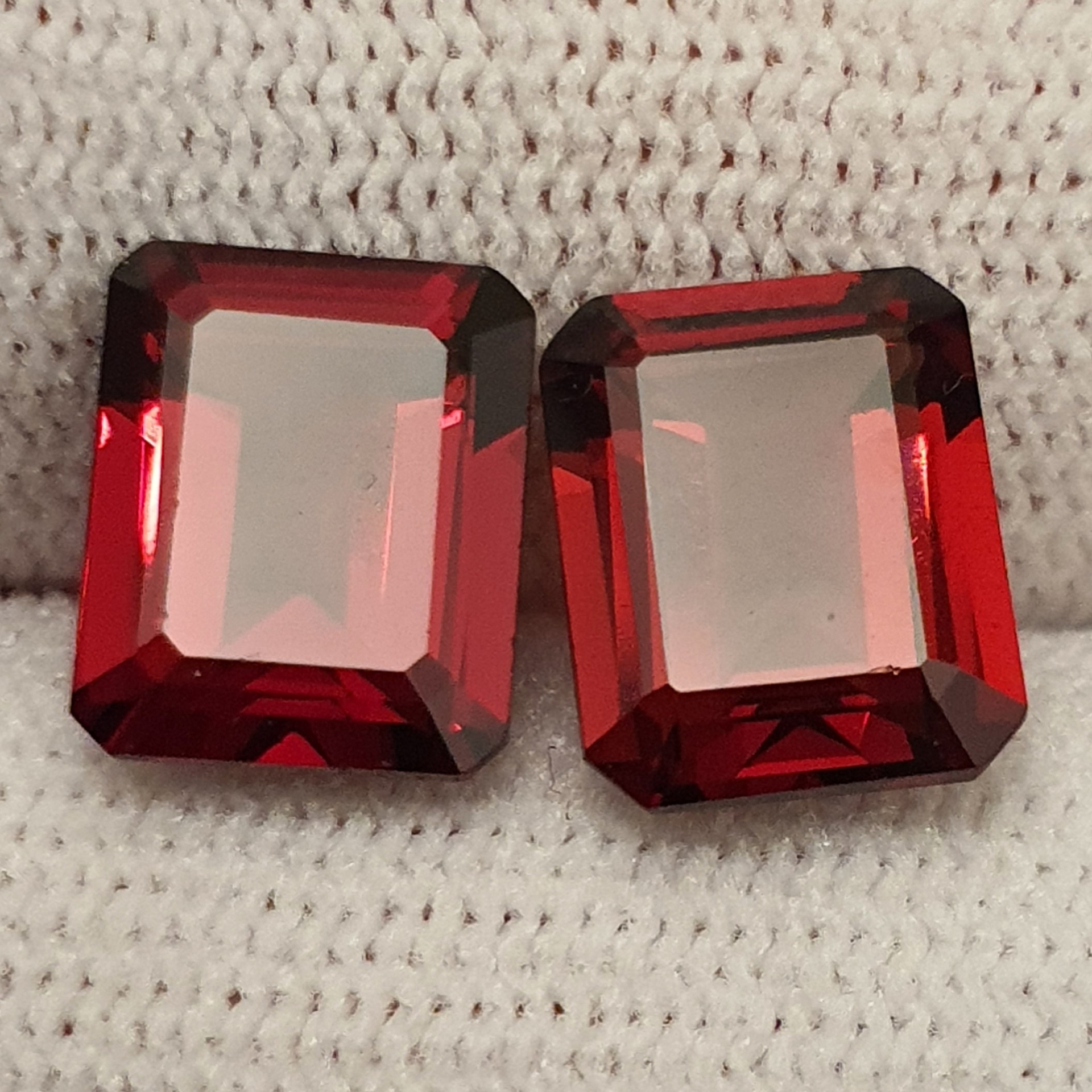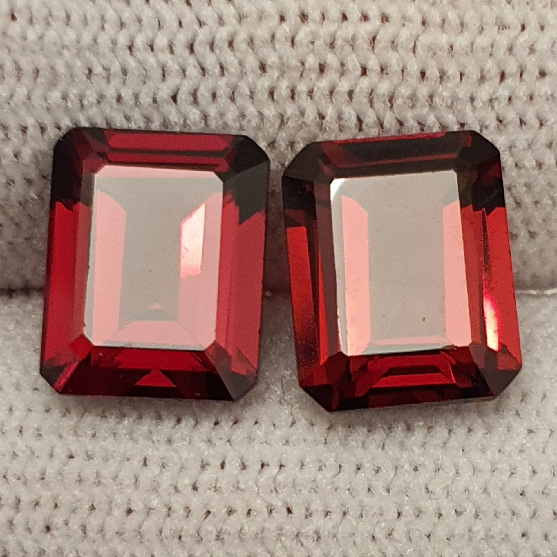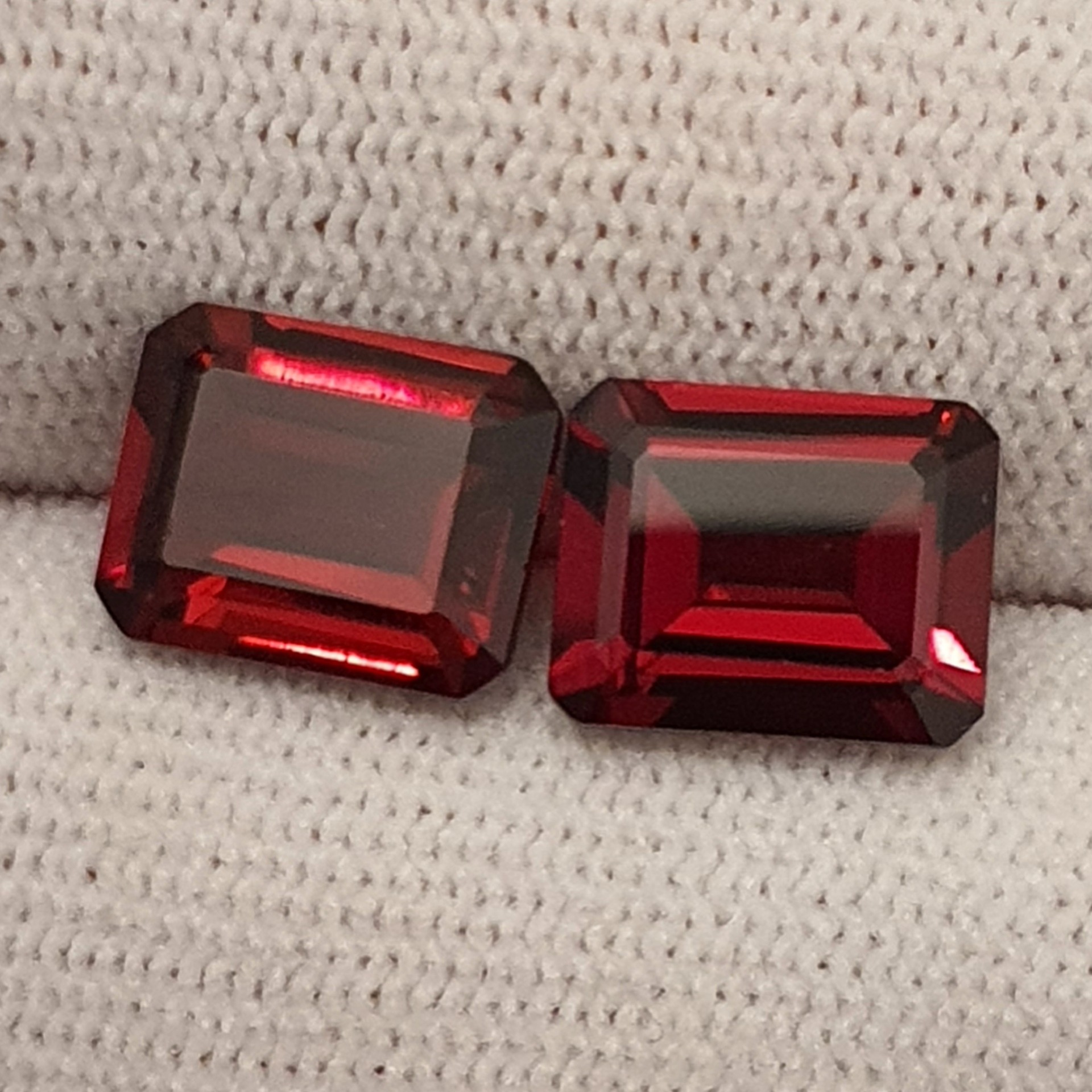 pereche granate naturale rosii in greutate de 7.36 carate, fatetate dreptunghi cu colturile taiate (octogon), cu dimensiunile 10 x 8mm; granatele sunt deosebit de frumoase si elegante